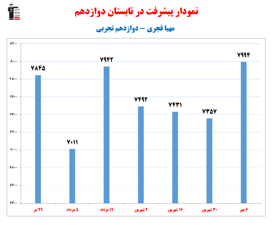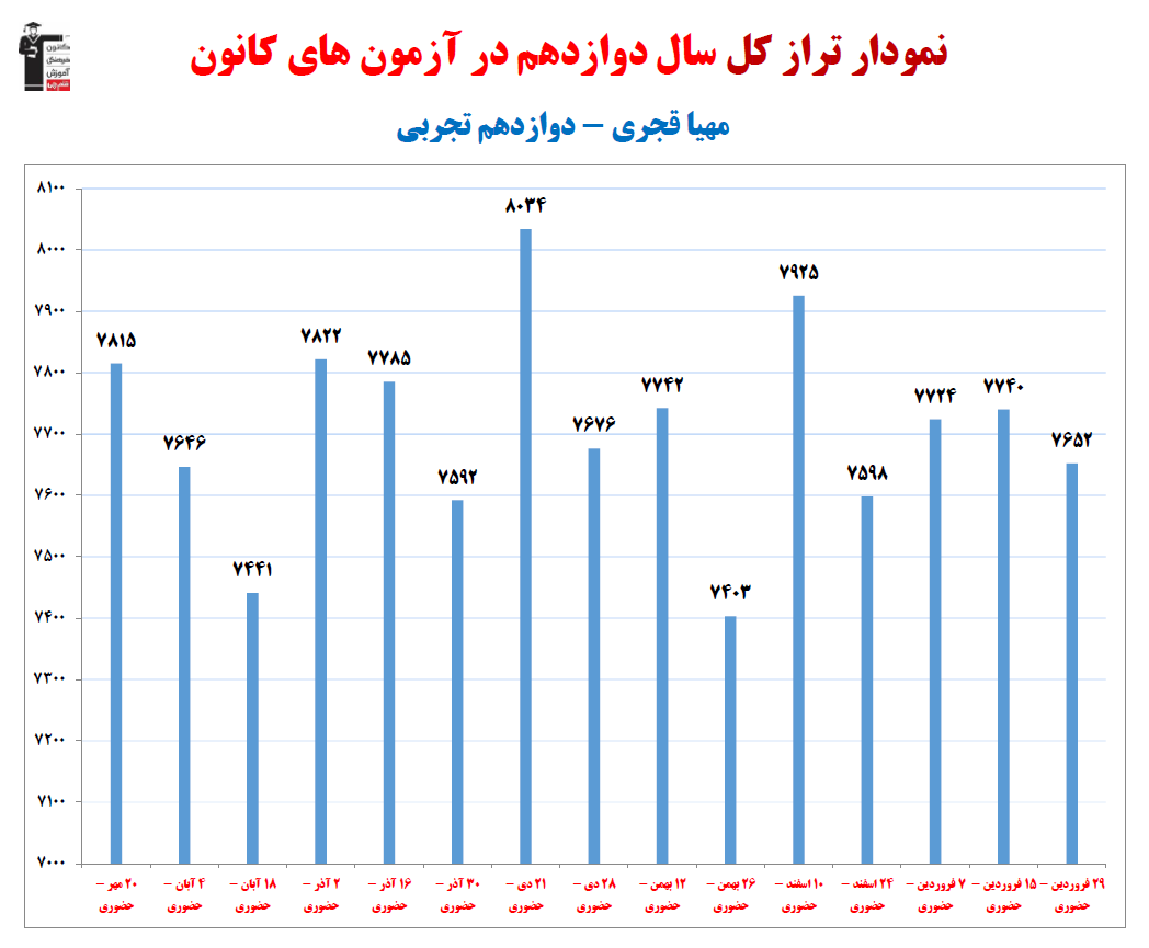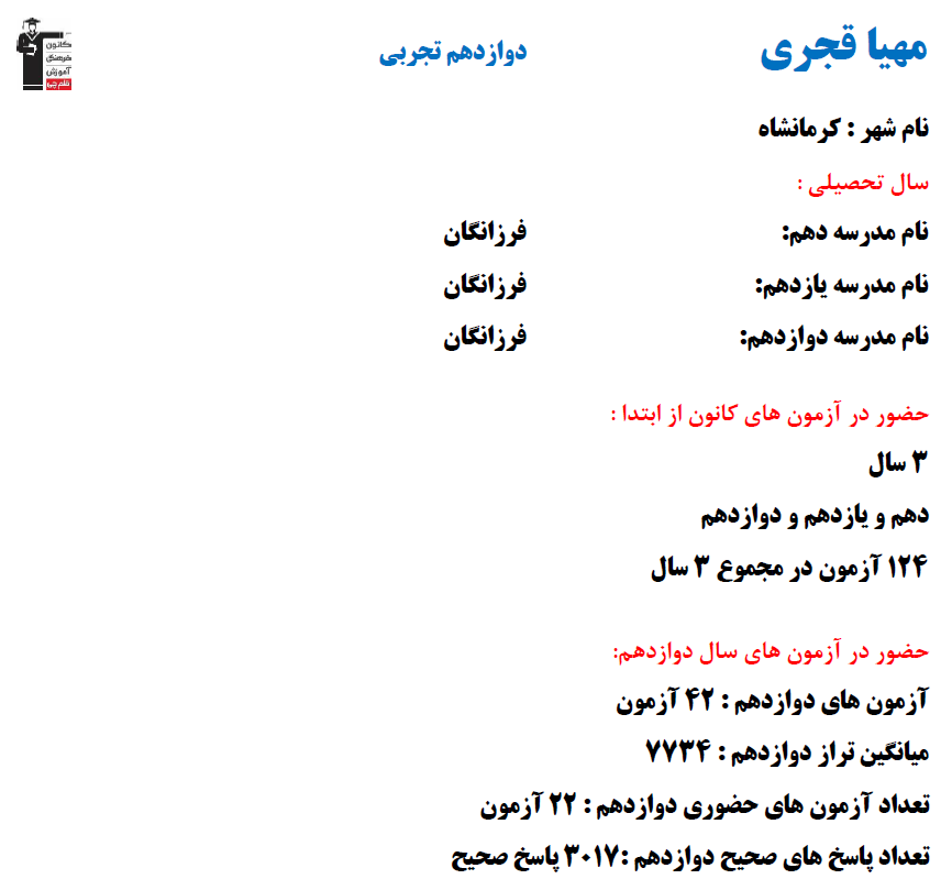 در ادامه میتوانید عملکرد درسی مهيا قجري را در کانون مشاهده کنید.نمودار پیشرفت میانگین تراز در پایههای مختلف، نمودار تراز کل، عملکرد آزمونهای سال دوازدهم و شروع از تابستان و تراز آزمون های تابستان، کارنامههای مبحثی در نمودارها و تصاویر زیر قابل مشاهده است.
