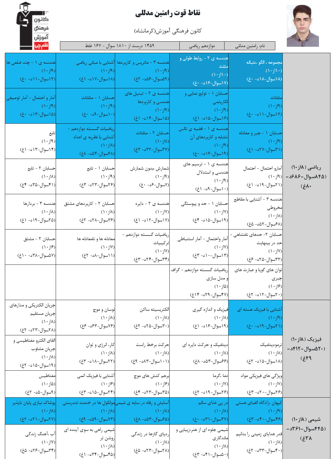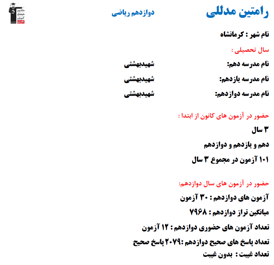 در ادامه میتوانید عملکرد درسی رامتين مدللي را در کانون مشاهده کنید.نمودار پیشرفت میانگین تراز در پایههای مختلف، نمودار تراز کل، عملکرد آزمونهای سال دوازدهم و شروع از تابستان و تراز آزمون های تابستان، کارنامههای مبحثی در نمودارها و تصاویر زیر قابل مشاهده است.