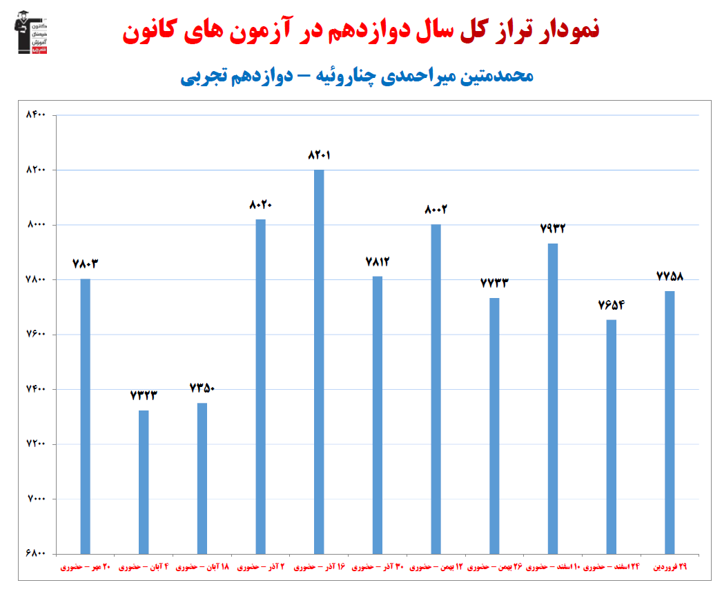 در ادامه میتوانید عملکرد درسی محمدمتين ميراحمدی را در کانون مشاهده کنید.نمودار پیشرفت میانگین تراز در پایههای مختلف، نمودار تراز کل، عملکرد آزمونهای سال دوازدهم و کارنامههای مبحثی در نمودارها و تصاویر زیر قابل مشاهده است.