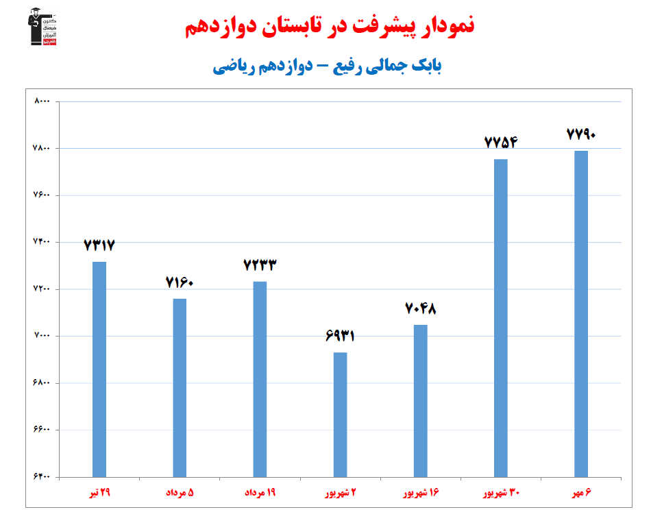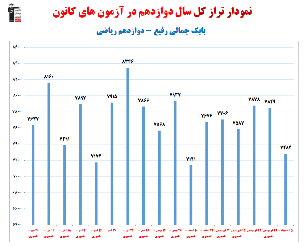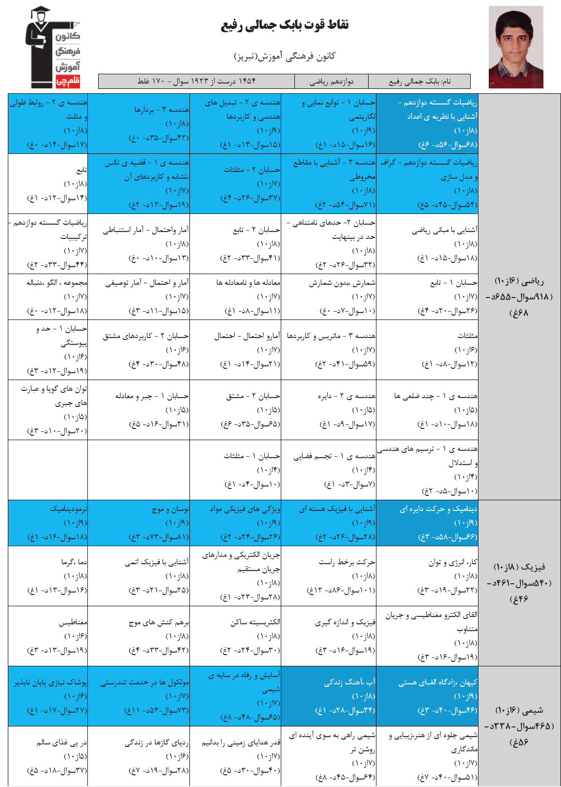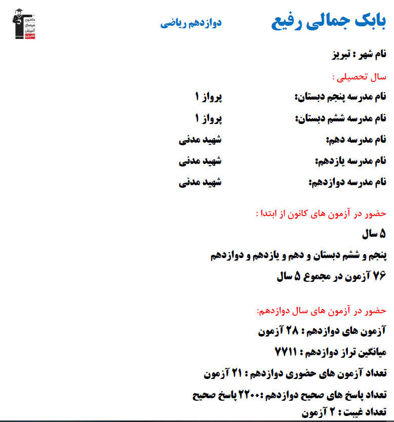 در ادامه میتوانید عملکرد درسی بابک جمالي را در کانون مشاهده کنید.نمودار پیشرفت میانگین تراز در پایههای مختلف، نمودار تراز کل، عملکرد آزمونهای سال دوازدهم و شروع از تابستان و تراز آزمون های تابستان، کارنامههای مبحثی در نمودارها و تصاویر زیر قابل مشاهده است.