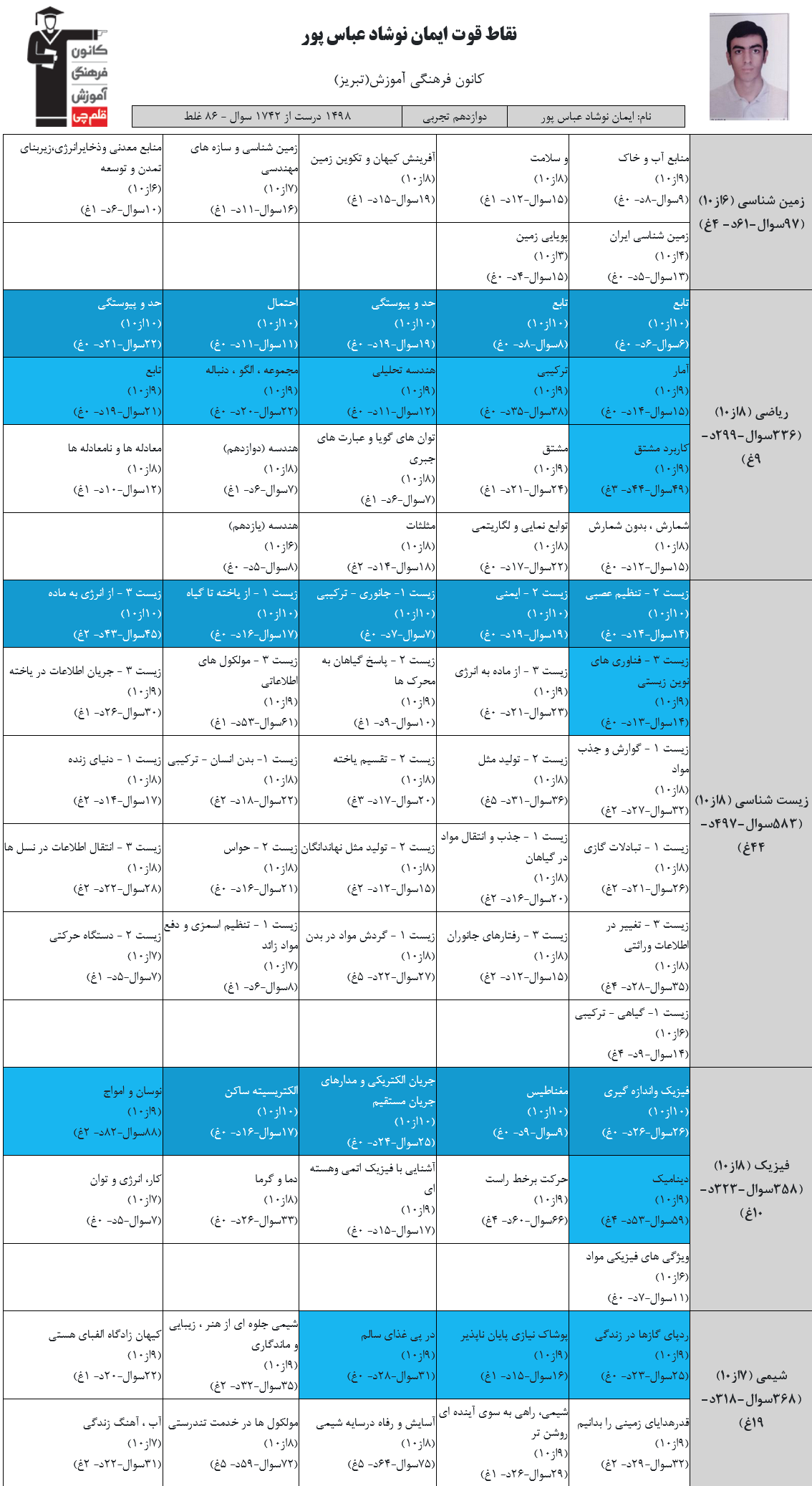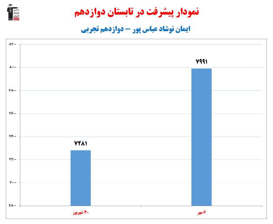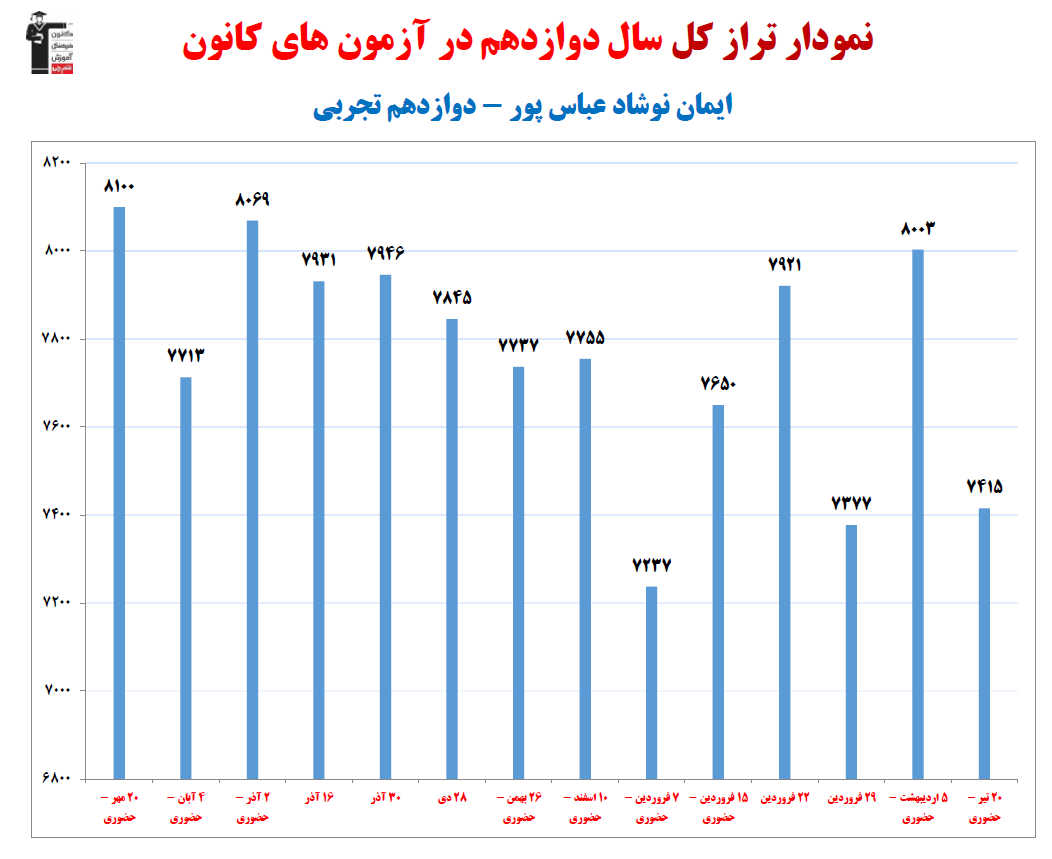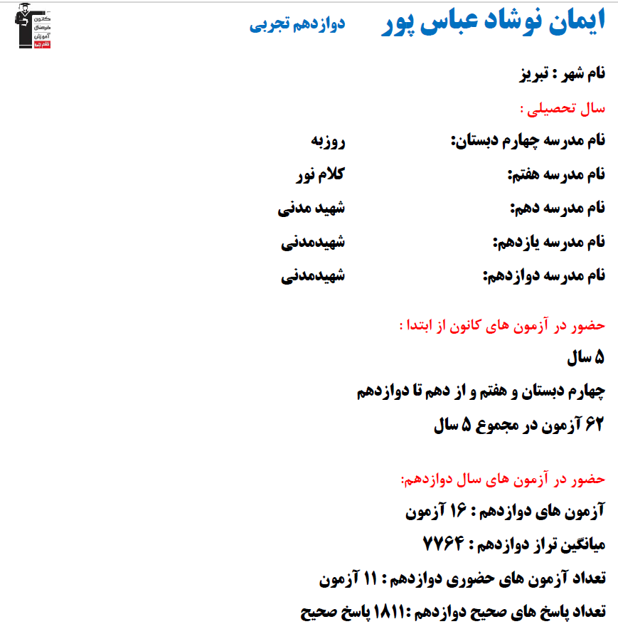 در ادامه میتوانید عملکرد درسی ايمان نوشاد عباسپور را در کانون مشاهده کنید.نمودار پیشرفت میانگین تراز در پایههای مختلف، نمودار تراز کل، عملکرد آزمونهای سال دوازدهم و شروع از تابستان و تراز آزمون های تابستان، کارنامههای مبحثی در نمودارها و تصاویر زیر قابل مشاهده است.