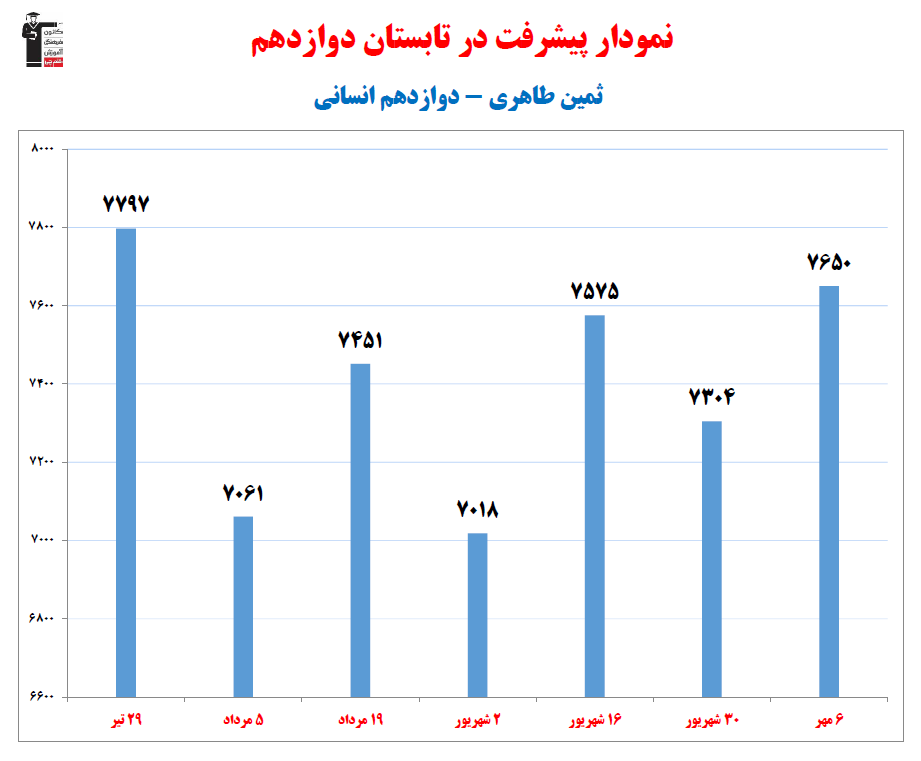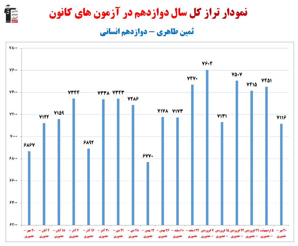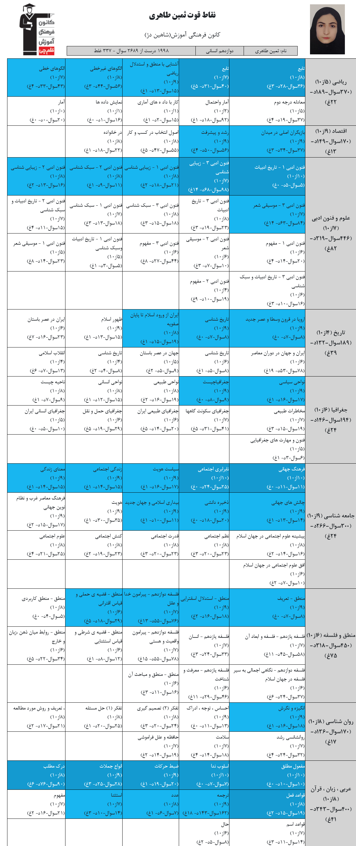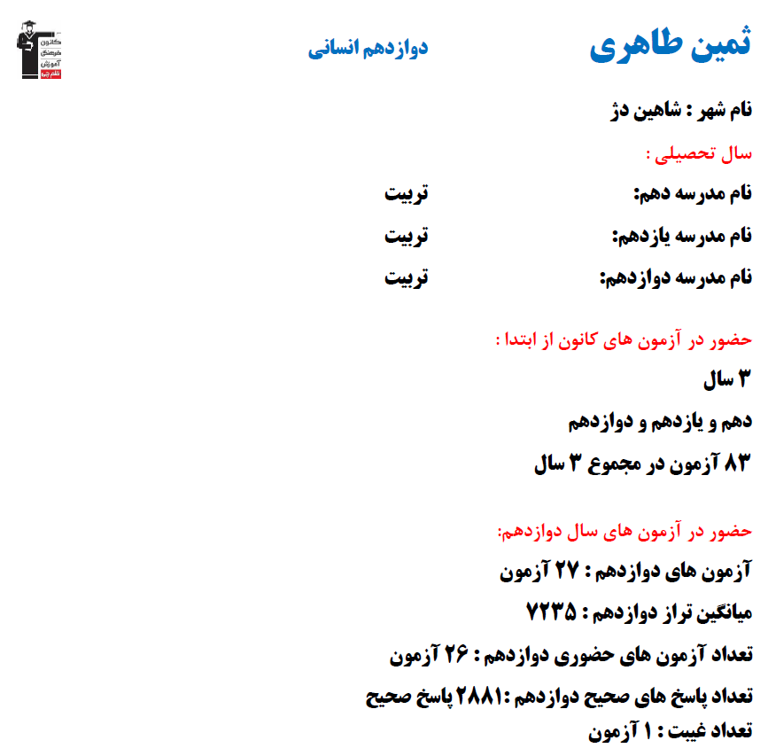 در ادامه میتوانید عملکرد درسی ثمین طاهری را در کانون مشاهده کنید.نمودار پیشرفت میانگین تراز در پایههای مختلف، نمودار تراز کل، عملکرد آزمونهای سال دوازدهم و شروع از تابستان و تراز آزمون های تابستان، کارنامههای مبحثی در نمودارها و تصاویر زیر قابل مشاهده است.