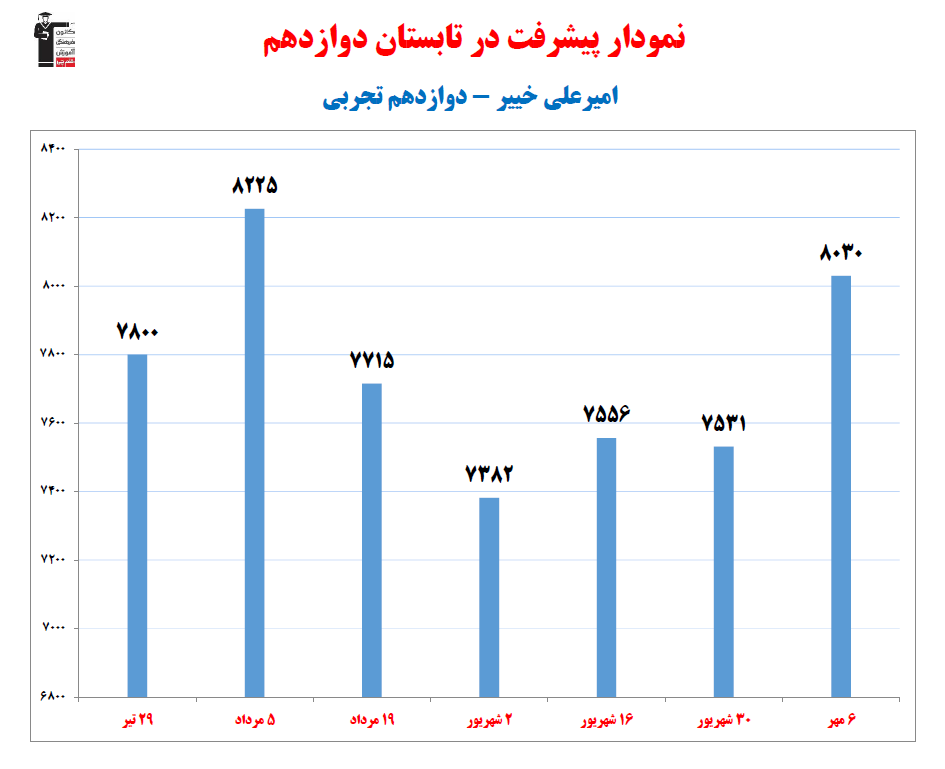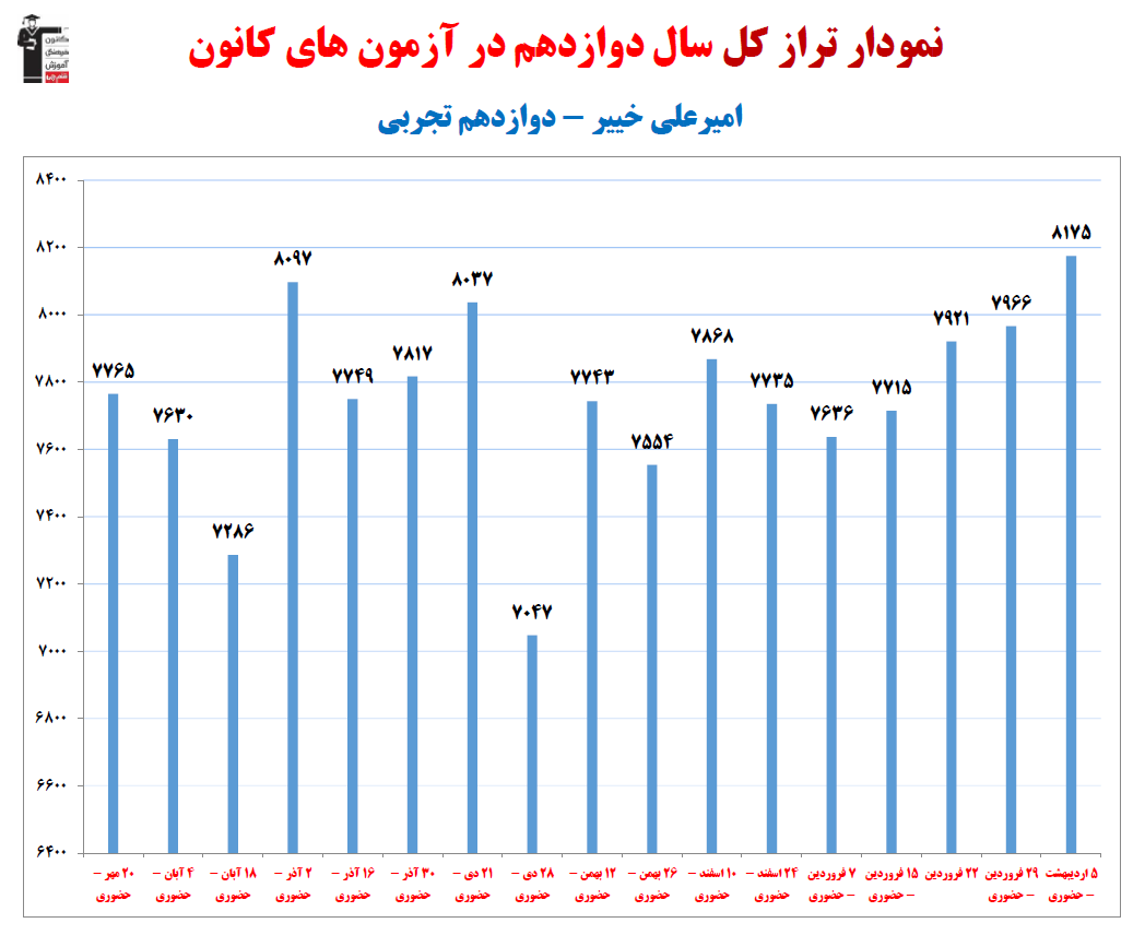 در ادامه میتوانید عملکرد درسی اميرعلي خيير را در کانون مشاهده کنید.نمودار پیشرفت میانگین تراز در پایههای مختلف، نمودار تراز کل، عملکرد آزمونهای سال دوازدهم و شروع از تابستان و تراز آزمون های تابستان، کارنامههای مبحثی در نمودارها و تصاویر زیر قابل مشاهده است.