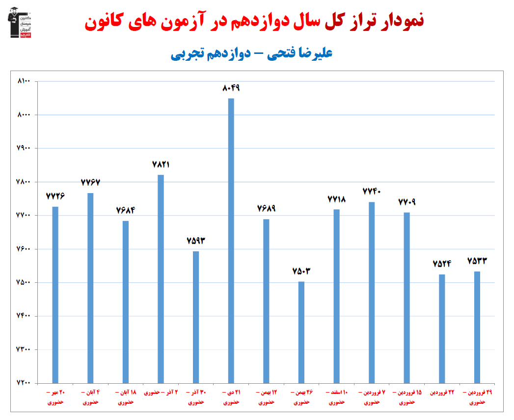در ادامه میتوانید عملکرد درسی عليرضا فتحي را در کانون مشاهده کنید.نمودار پیشرفت میانگین تراز در پایههای مختلف، نمودار تراز کل، عملکرد آزمونهای سال دوازدهم و کارنامههای مبحثی در نمودارها و تصاویر زیر قابل مشاهده است.