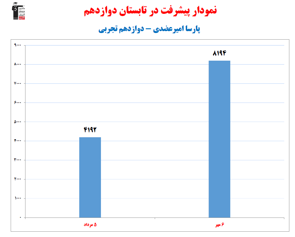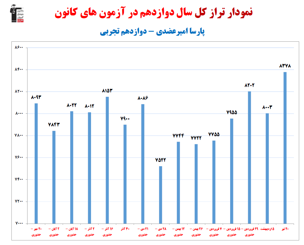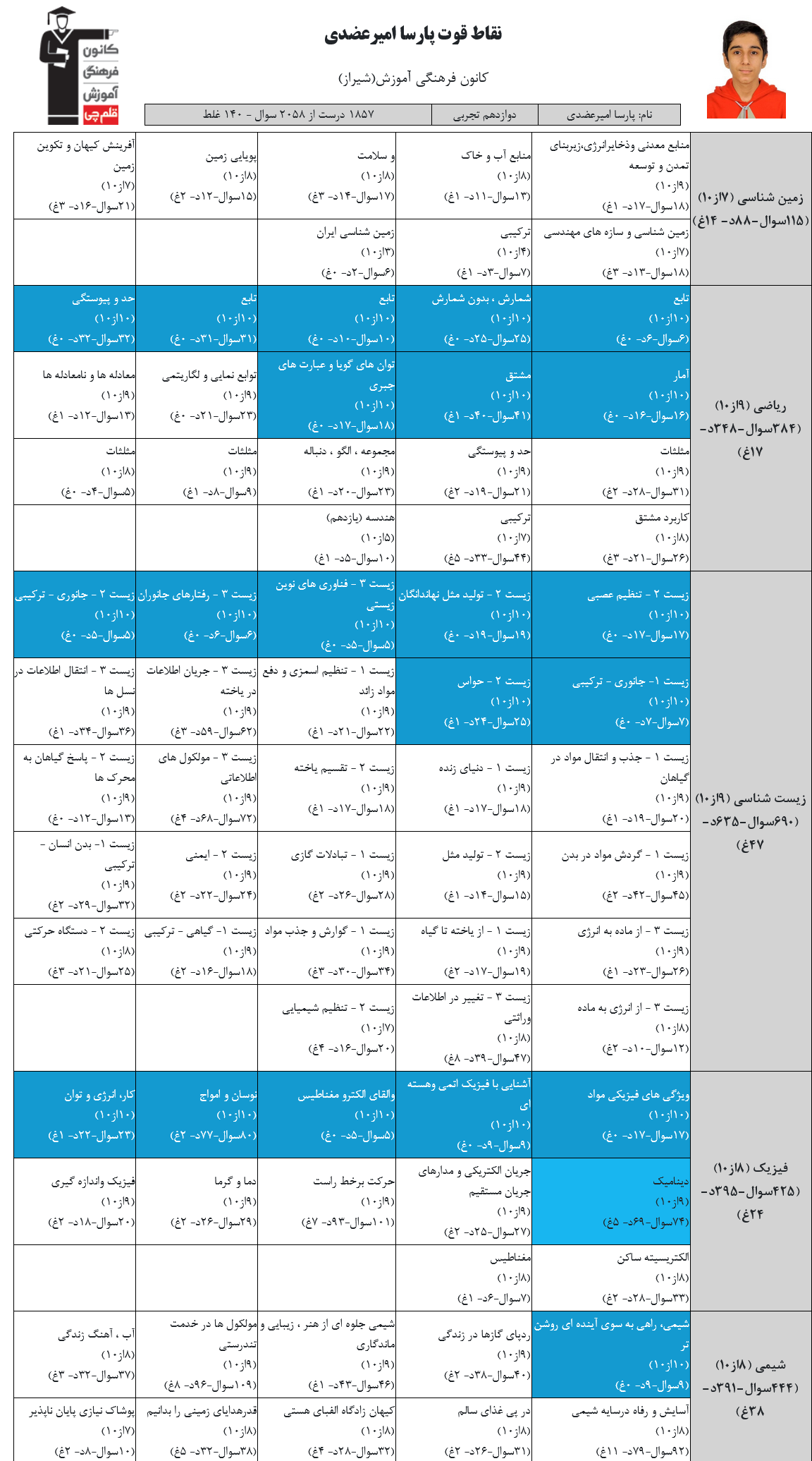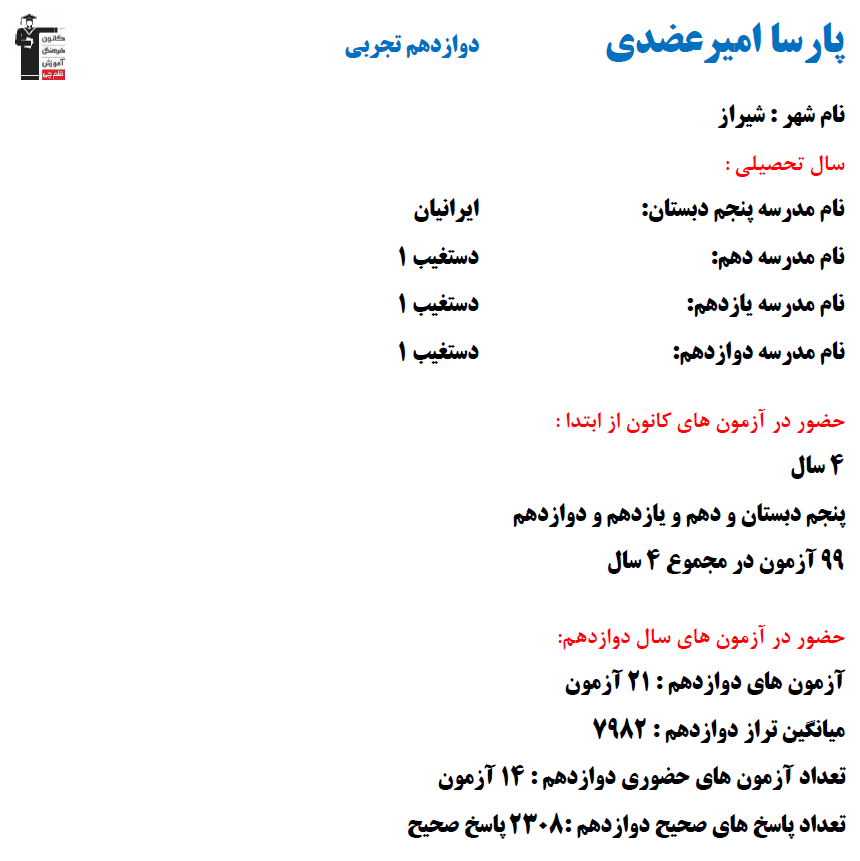 در ادامه میتوانید عملکرد درسی پارسا اميرعضدي را در کانون مشاهده کنید.نمودار پیشرفت میانگین تراز در پایههای مختلف، نمودار تراز کل، عملکرد آزمونهای سال دوازدهم و شروع از تابستان و تراز آزمون های تابستان، کارنامههای مبحثی در نمودارها و تصاویر زیر قابل مشاهده است.