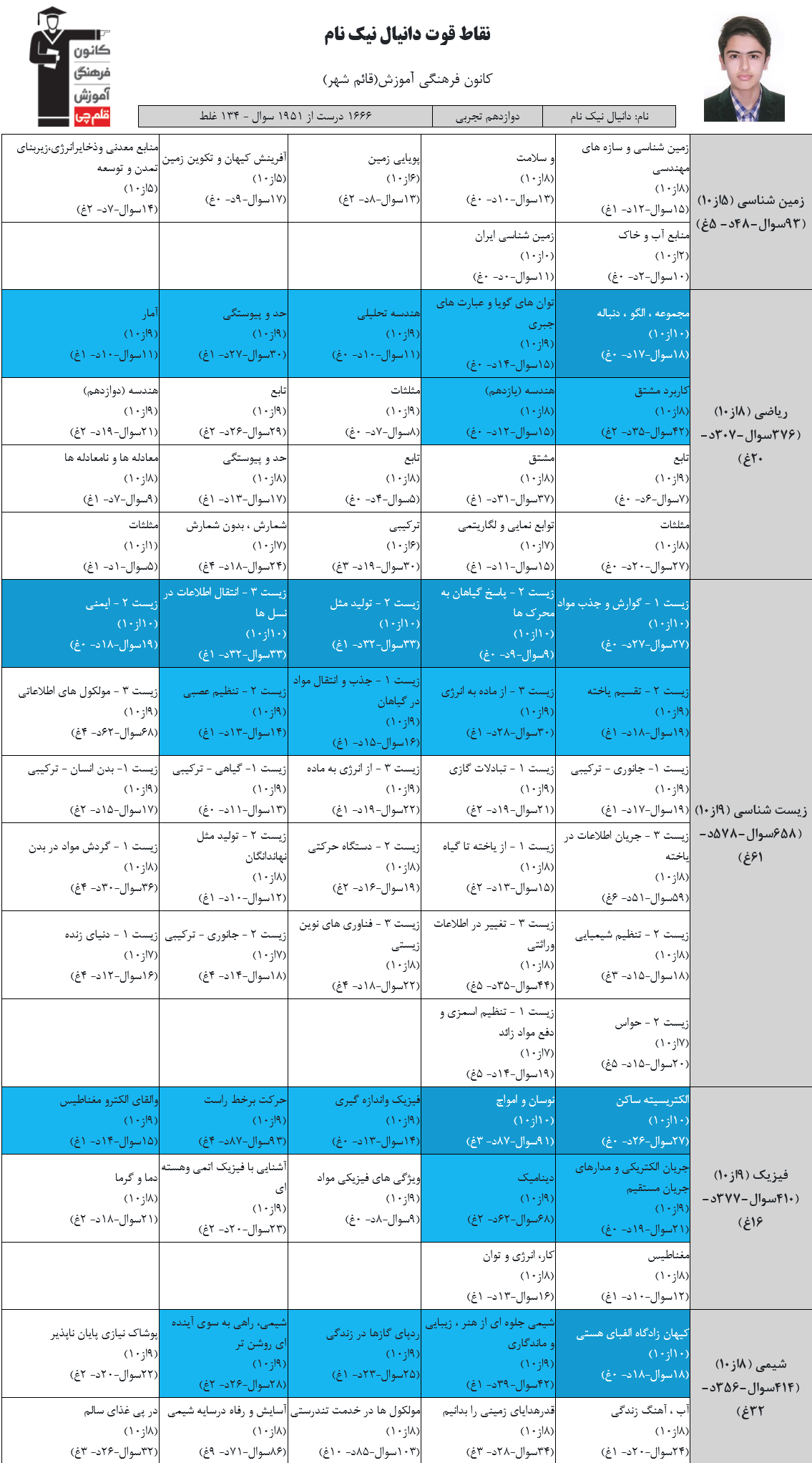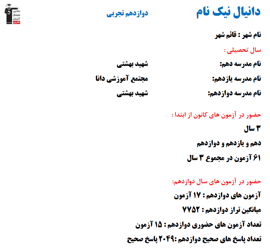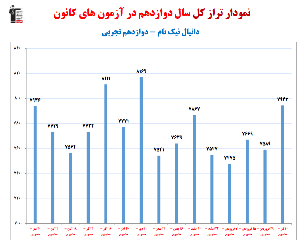 در ادامه میتوانید عملکرد درسی دانيال نيک نام را در کانون مشاهده کنید.نمودار پیشرفت میانگین تراز در پایههای مختلف، نمودار تراز کل، عملکرد آزمونهای سال دوازدهم و شروع از تابستان و تراز آزمون های تابستان، کارنامههای مبحثی در نمودارها و تصاویر زیر قابل مشاهده است.