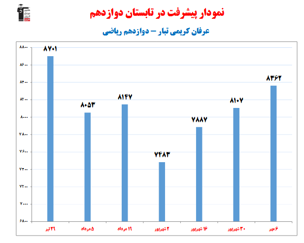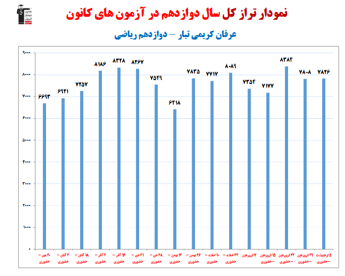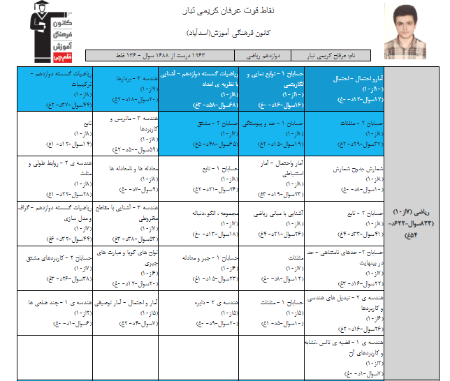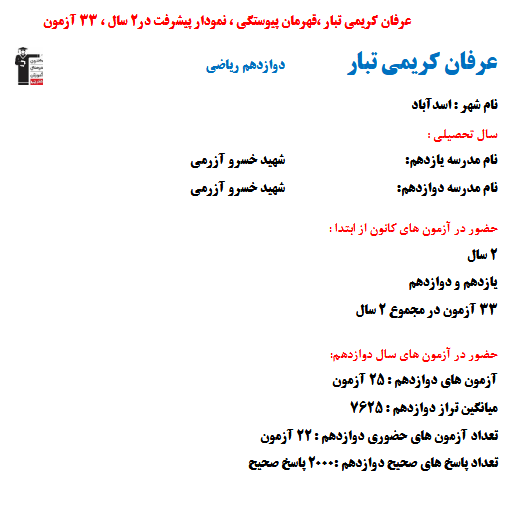 در ادامه میتوانید عملکرد درسی عرفان کریمی تبار را در کانون مشاهده کنید.نمودار پیشرفت میانگین تراز در پایههای مختلف، نمودار تراز کل، عملکرد آزمونهای سال دوازدهم و شروع از تابستان و تراز آزمون های تابستان، کارنامههای مبحثی در نمودارها و تصاویر زیر قابل مشاهده است.