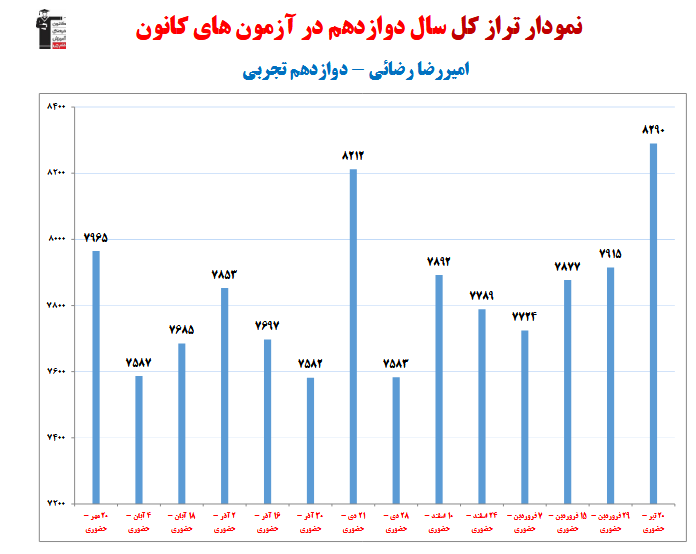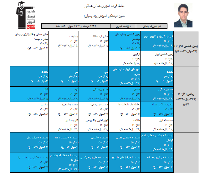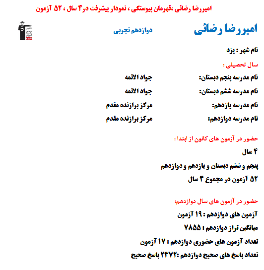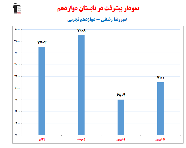 در ادامه میتوانید عملکرد درسی امیررضا رضایی را در کانون مشاهده کنید.نمودار پیشرفت میانگین تراز در پایههای مختلف، نمودار تراز کل، عملکرد آزمونهای سال دوازدهم و شروع از تابستان و تراز آزمون های تابستان، کارنامههای مبحثی در نمودارها و تصاویر زیر قابل مشاهده است.
