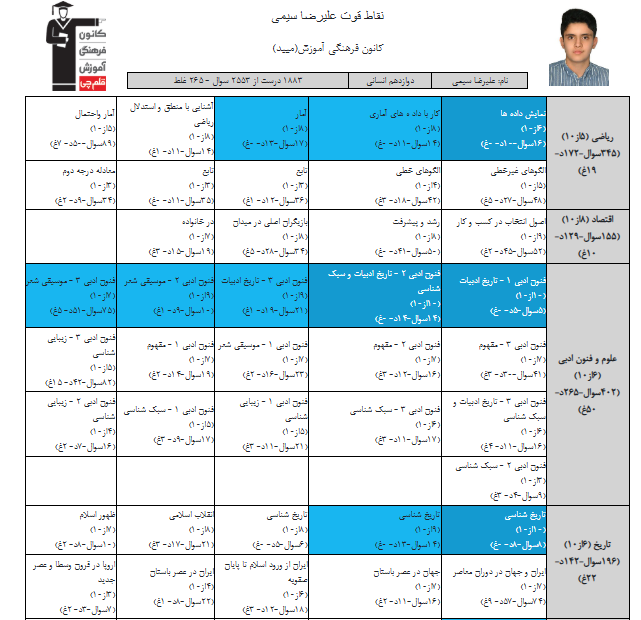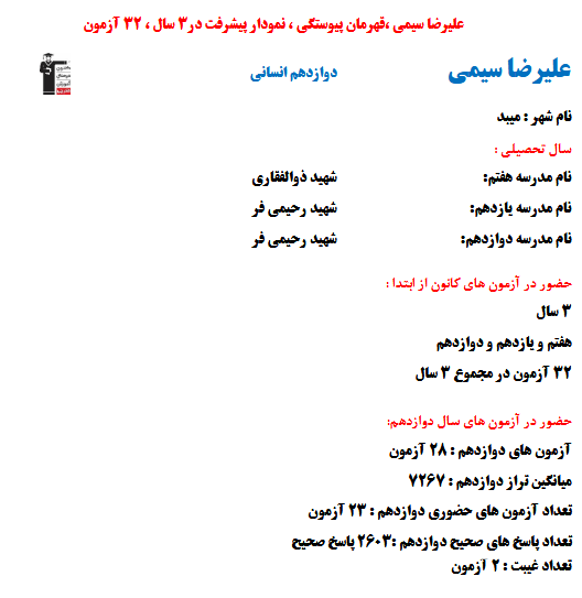 در ادامه میتوانید عملکرد درسی علیرضا سیمی را در کانون مشاهده کنید.نمودار پیشرفت میانگین تراز در پایههای مختلف، نمودار تراز کل، عملکرد آزمونهای سال دوازدهم و شروع از تابستان و تراز آزمون های تابستان، کارنامههای مبحثی در نمودارها و تصاویر زیر قابل مشاهده است.