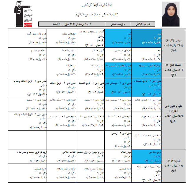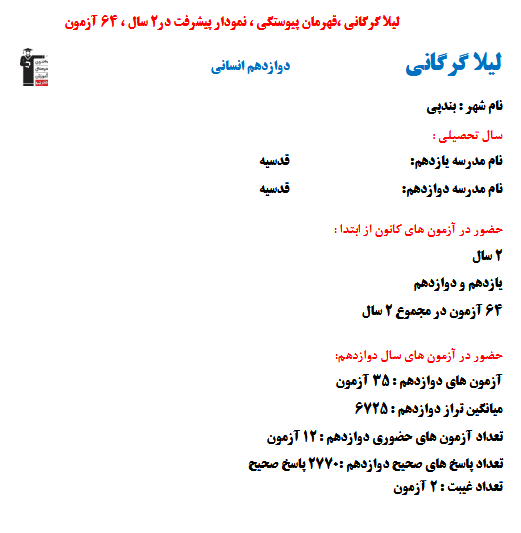 در ادامه میتوانید عملکرد درسی لیلا گرگانی را در کانون مشاهده کنید.نمودار پیشرفت میانگین تراز در پایههای مختلف، نمودار تراز کل، عملکرد آزمونهای سال دوازدهم و شروع از تابستان و تراز آزمون های تابستان، کارنامههای مبحثی در نمودارها و تصاویر زیر قابل مشاهده است.