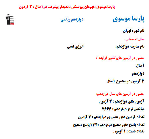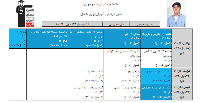 در ادامه میتوانید عملکرد درسی پارسا موسوی را در کانون مشاهده کنید.نمودار تراز کل، عملکرد آزمونهای سال دوازدهم، کارنامههای مبحثی در نمودارها و تصاویر زیر قابل مشاهده است.