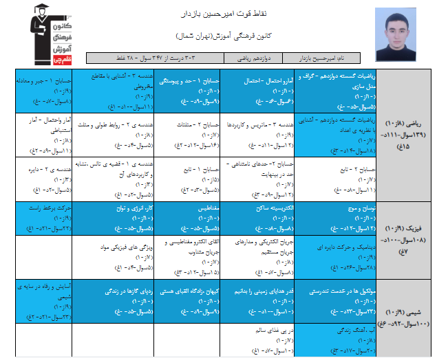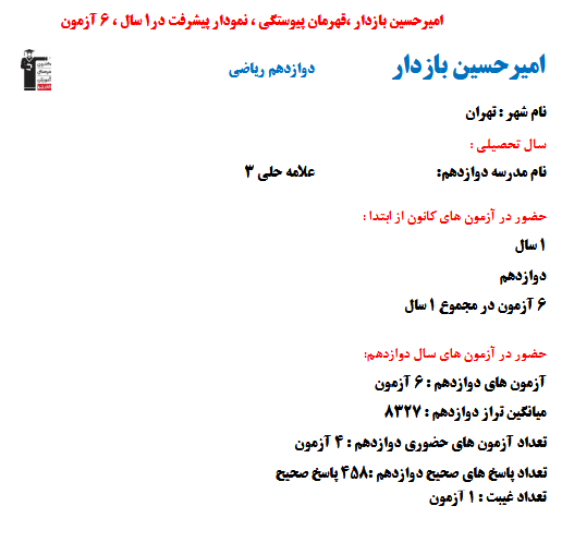 در ادامه میتوانید عملکرد درسی امیر حسین بازدار را در کانون مشاهده کنید. نمودار تراز کل، عملکرد آزمونهای سال دوازدهم، کارنامههای مبحثی در نمودارها و تصاویر زیر قابل مشاهده است.