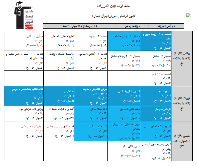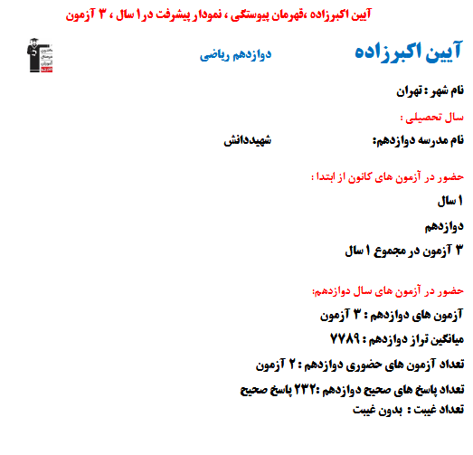 در ادامه میتوانید عملکرد درسی آئین اکبرزاده را در کانون مشاهده کنید. نمودار تراز کل، عملکرد آزمونهای سال دوازدهم، کارنامههای مبحثی در نمودارها و تصاویر زیر قابل مشاهده است.