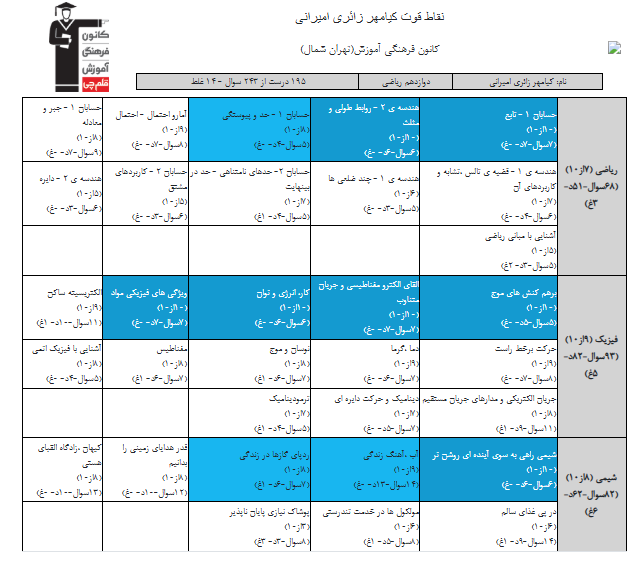 در ادامه میتوانید عملکرد درسی کیامهر زائری امیرانی را در کانون مشاهده کنید. نمودار تراز کل، عملکرد آزمونهای سال دوازدهم ، کارنامههای مبحثی در نمودارها و تصاویر زیر قابل مشاهده است.