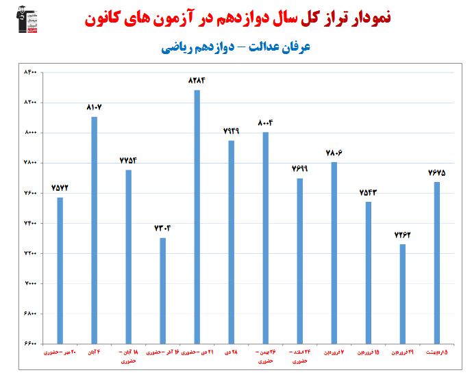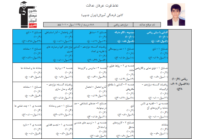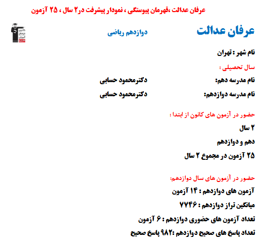 در ادامه میتوانید عملکرد درسی عرفان عدالت را در کانون مشاهده کنید.نمودار پیشرفت میانگین تراز در پایههای مختلف، نمودار تراز کل، عملکرد آزمونهای سال دوازدهم ، کارنامههای مبحثی در نمودارها و تصاویر زیر قابل مشاهده است.