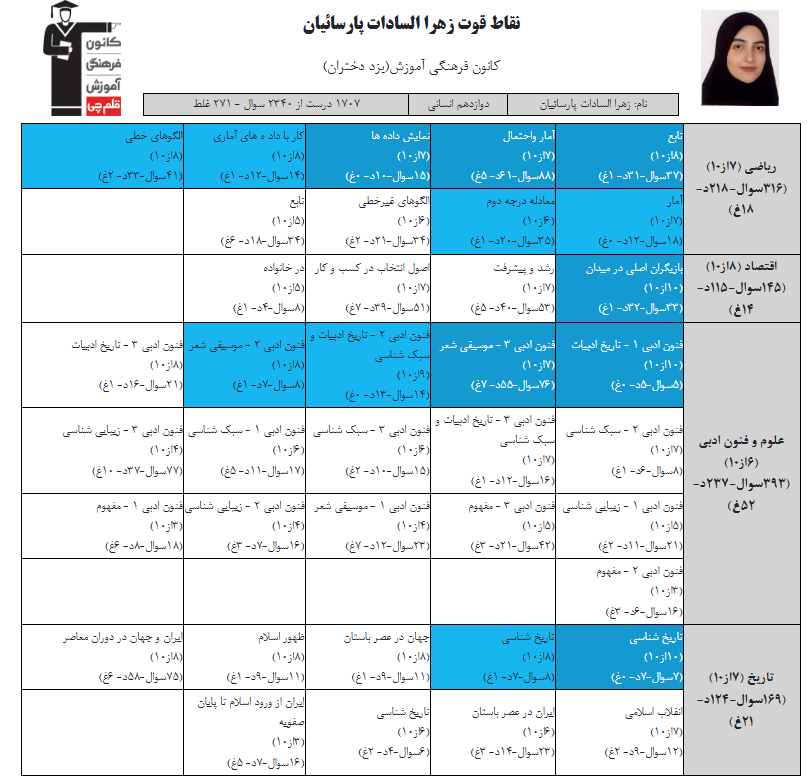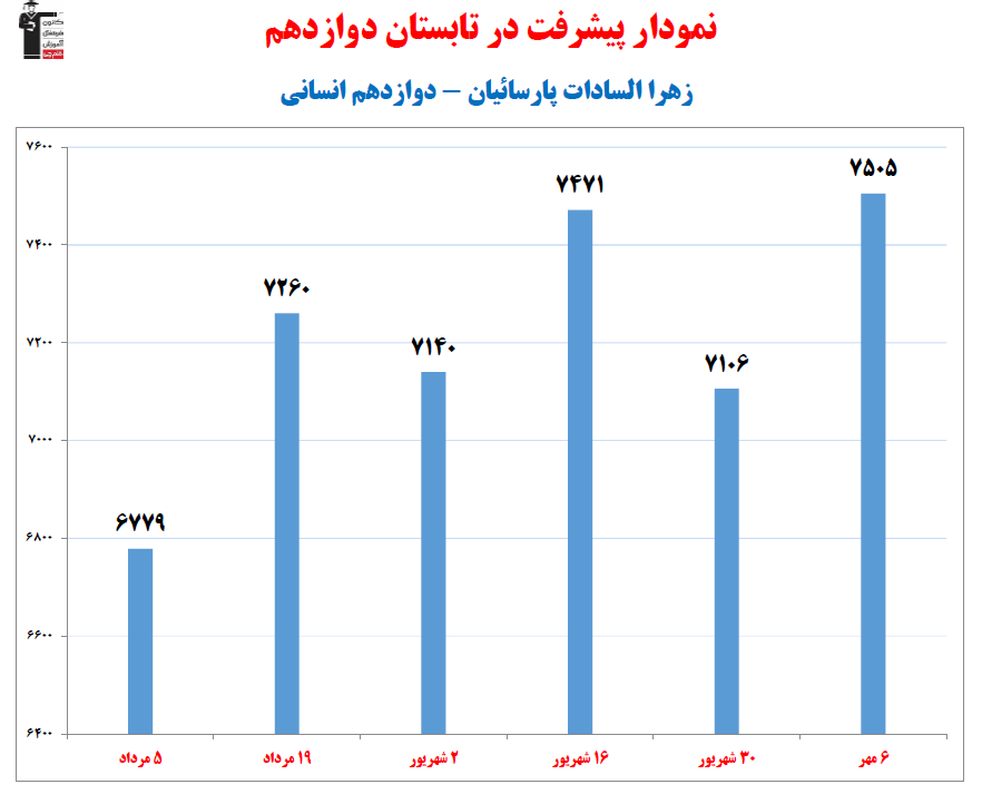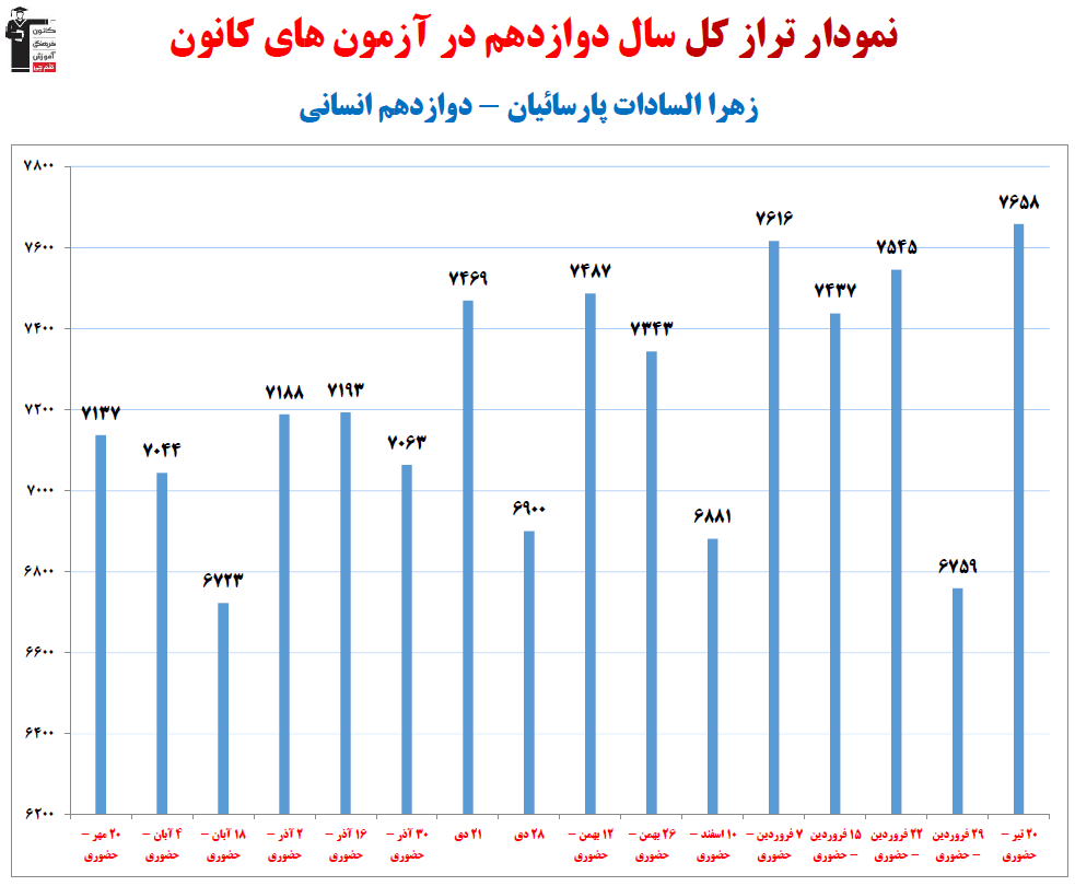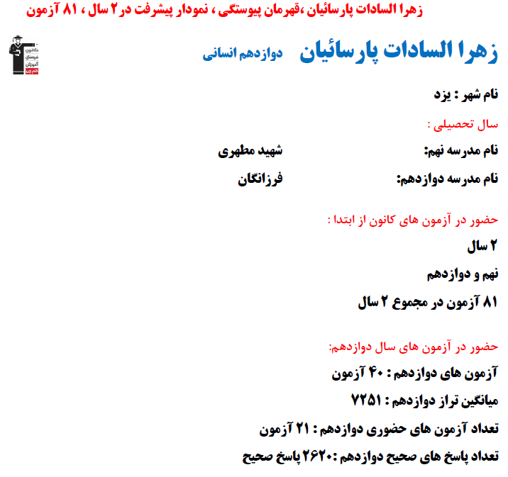 در ادامه میتوانید عملکرد درسی زهرا سادات پارسائیان را در کانون مشاهده کنید.نمودار پیشرفت میانگین تراز در پایههای مختلف، نمودار تراز کل، عملکرد آزمونهای سال دوازدهم و شروع از تابستان و تراز آزمون های تابستان، کارنامههای مبحثی در نمودارها و تصاویر زیر قابل مشاهده است.