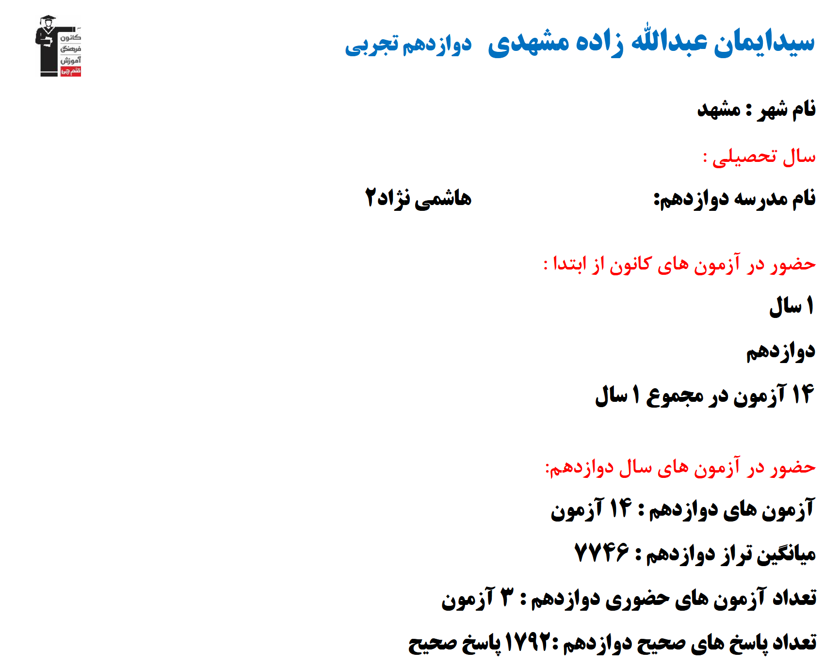 در ادامه میتوانید عملکرد درسی ايمان عبدالله زاده را در کانون مشاهده کنید. نمودار تراز کل، عملکرد آزمونهای سال دوازدهم و کارنامههای مبحثی در نمودارها و تصاویر زیر قابل مشاهده است.