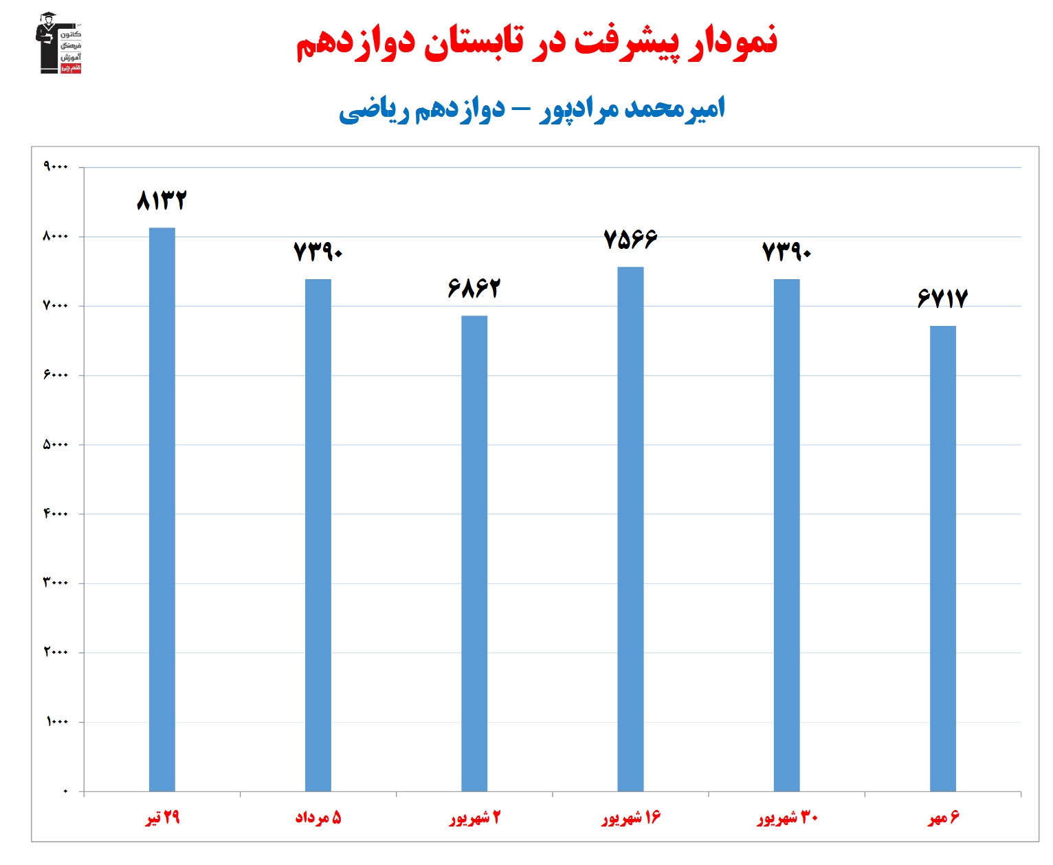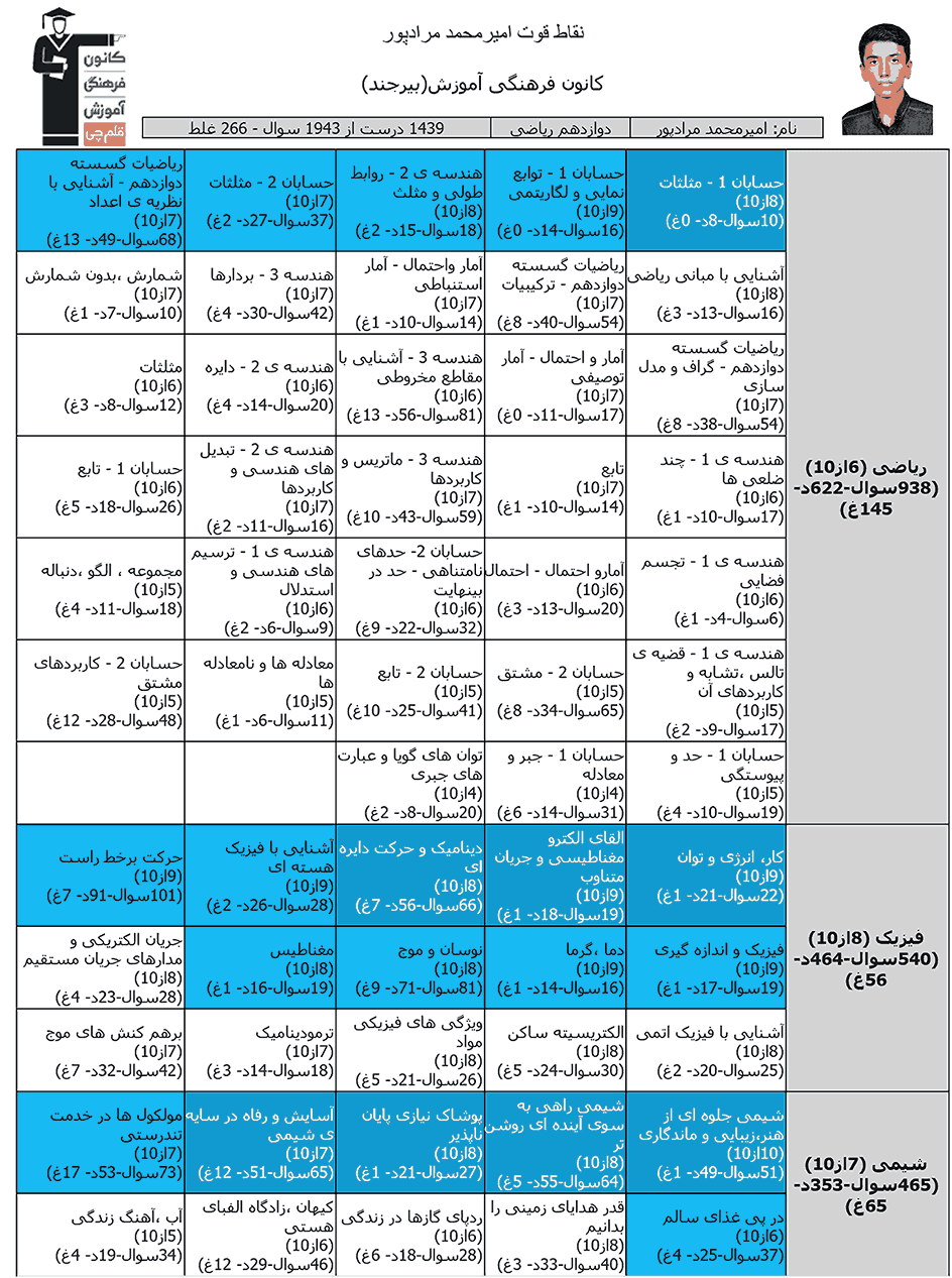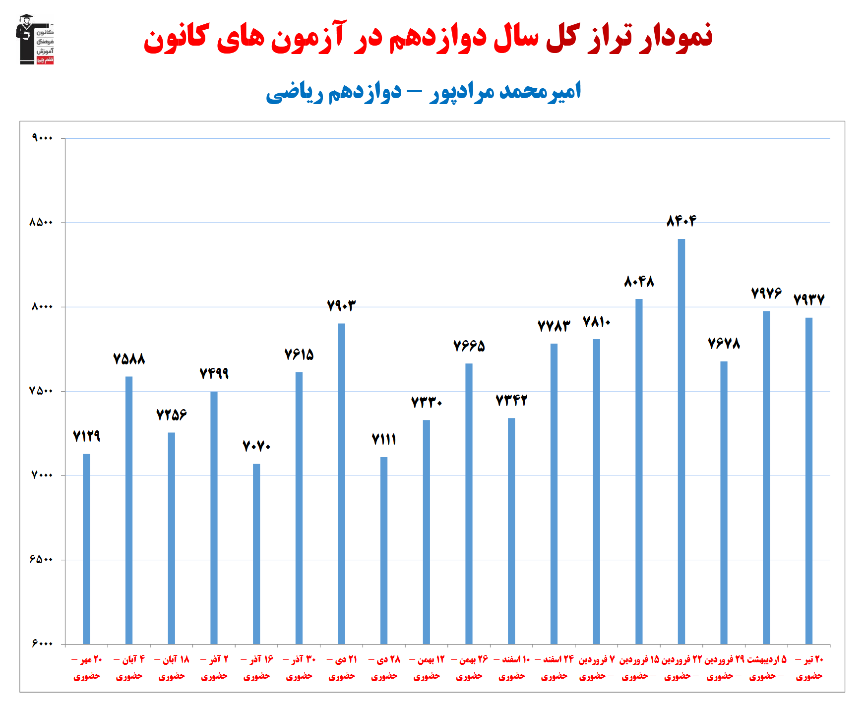 در ادامه میتوانید عملکرد درسی اميرمحمد مرادپور را در کانون مشاهده کنید.نمودار پیشرفت میانگین تراز در پایههای مختلف، نمودار تراز کل، عملکرد آزمونهای سال دوازدهم و شروع از تابستان و تراز آزمون های تابستان، کارنامههای مبحثی در نمودارها و تصاویر زیر قابل مشاهده است.