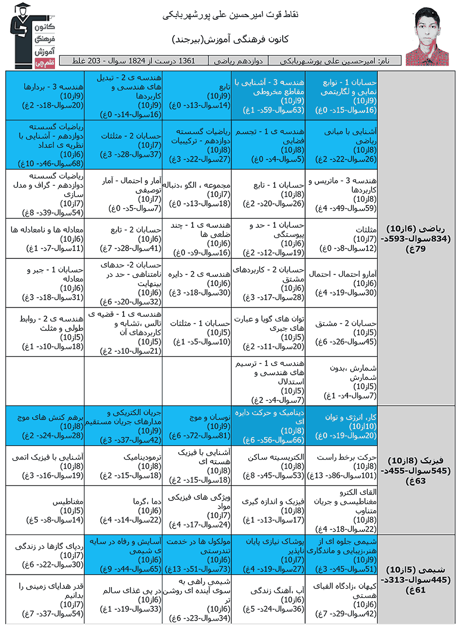 در ادامه میتوانید عملکرد درسی اميرحسين علي پور را در کانون مشاهده کنید.نمودار تراز کل، عملکرد آزمونهای سال دوازدهم و کارنامههای مبحثی در نمودارها و تصاویر زیر قابل مشاهده است.