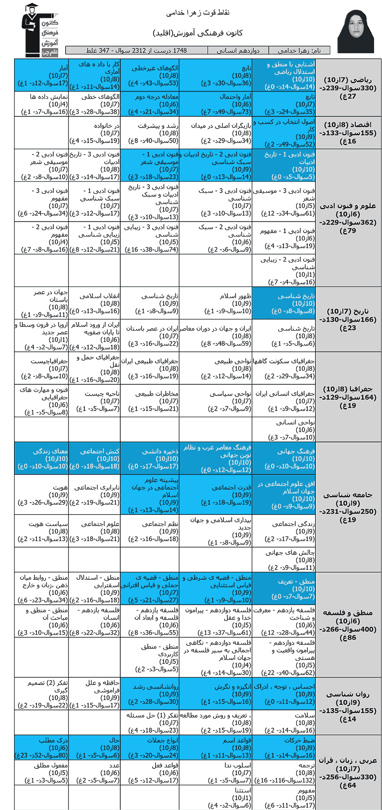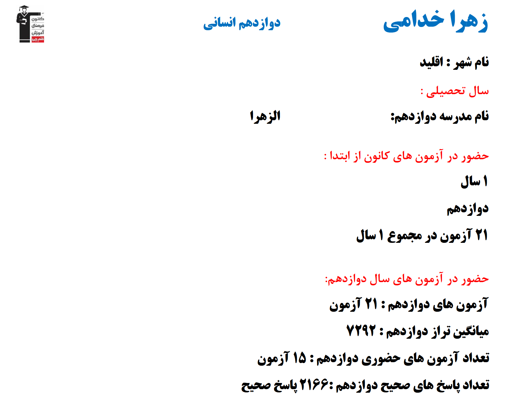 با برترهای دوازدهم انسانی ۱۴۰۴ آشنا شوید:در ادامه میتوانید عملکرد درسی زهرا خدامی را در کانون مشاهده کنید. نمودار تراز کل، عملکرد آزمونهای سال دوازدهم و کارنامههای مبحثی در نمودارها و تصاویر زیر قابل مشاهده است.