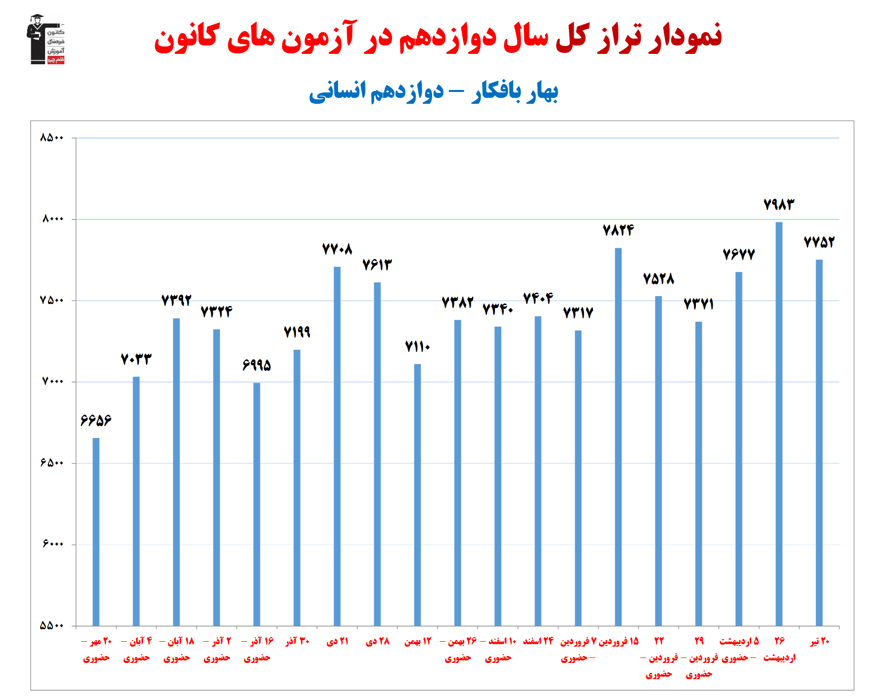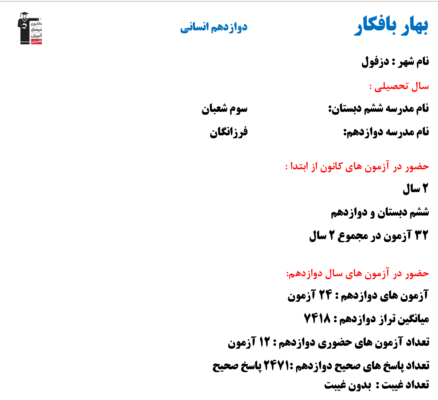 در ادامه میتوانید عملکرد درسی بهار بافکار را در کانون مشاهده کنید.نمودار پیشرفت میانگین تراز در پایههای مختلف، نمودار تراز کل، عملکرد آزمونهای سال دوازدهم و کارنامههای مبحثی در نمودارها و تصاویر زیر قابل مشاهده است.