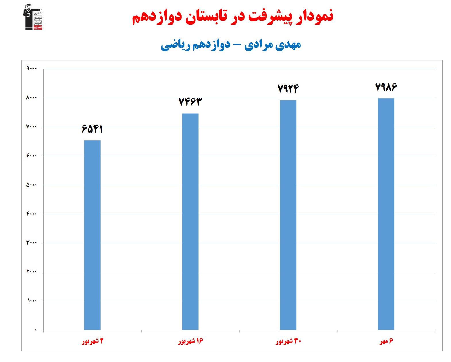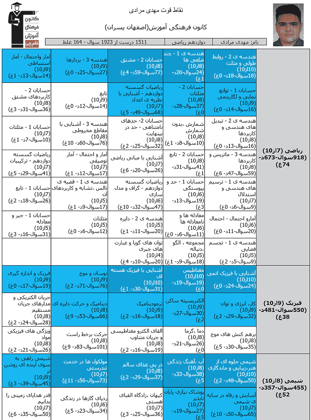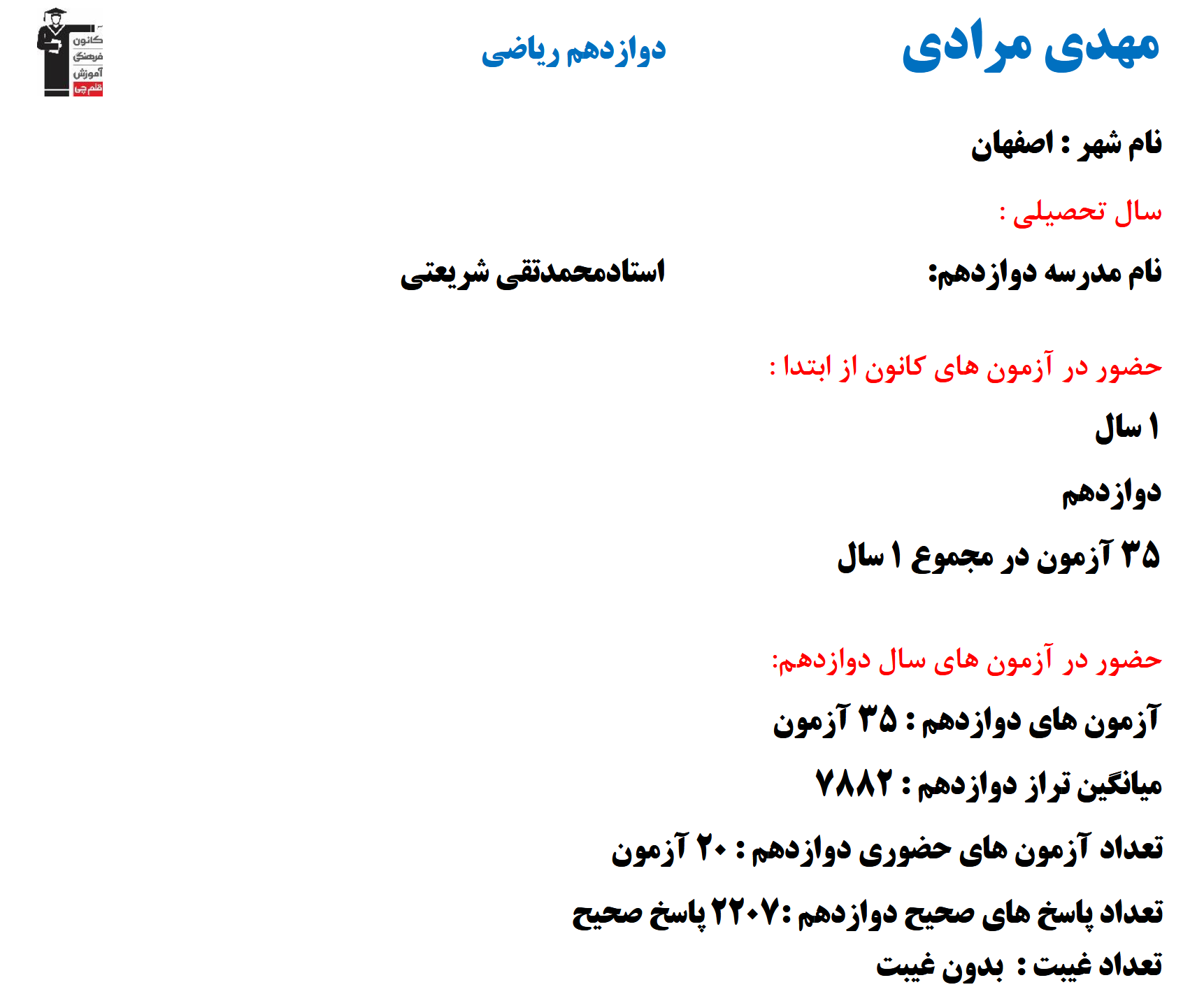 در ادامه میتوانید عملکرد درسی مهدي مرادي را در کانون مشاهده کنید.نمودار پیشرفت میانگین تراز در پایههای مختلف، نمودار تراز کل، عملکرد آزمونهای سال دوازدهم و شروع از تابستان و تراز آزمون های تابستان، کارنامههای مبحثی در نمودارها و تصاویر زیر قابل مشاهده است.