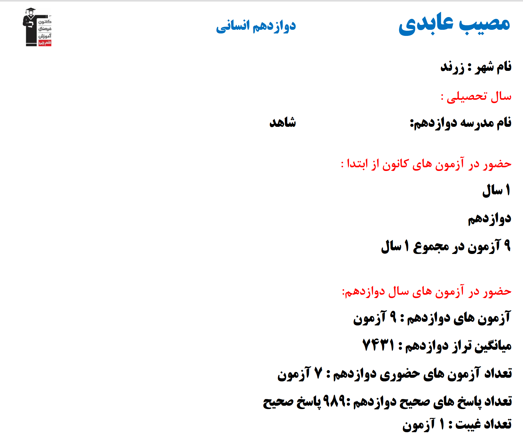 در ادامه میتوانید عملکرد درسی مصيب عابدي را در کانون مشاهده کنید.نمودار تراز کل، عملکرد آزمونهای سال دوازدهم و کارنامههای مبحثی در نمودارها و تصاویر زیر قابل مشاهده است.