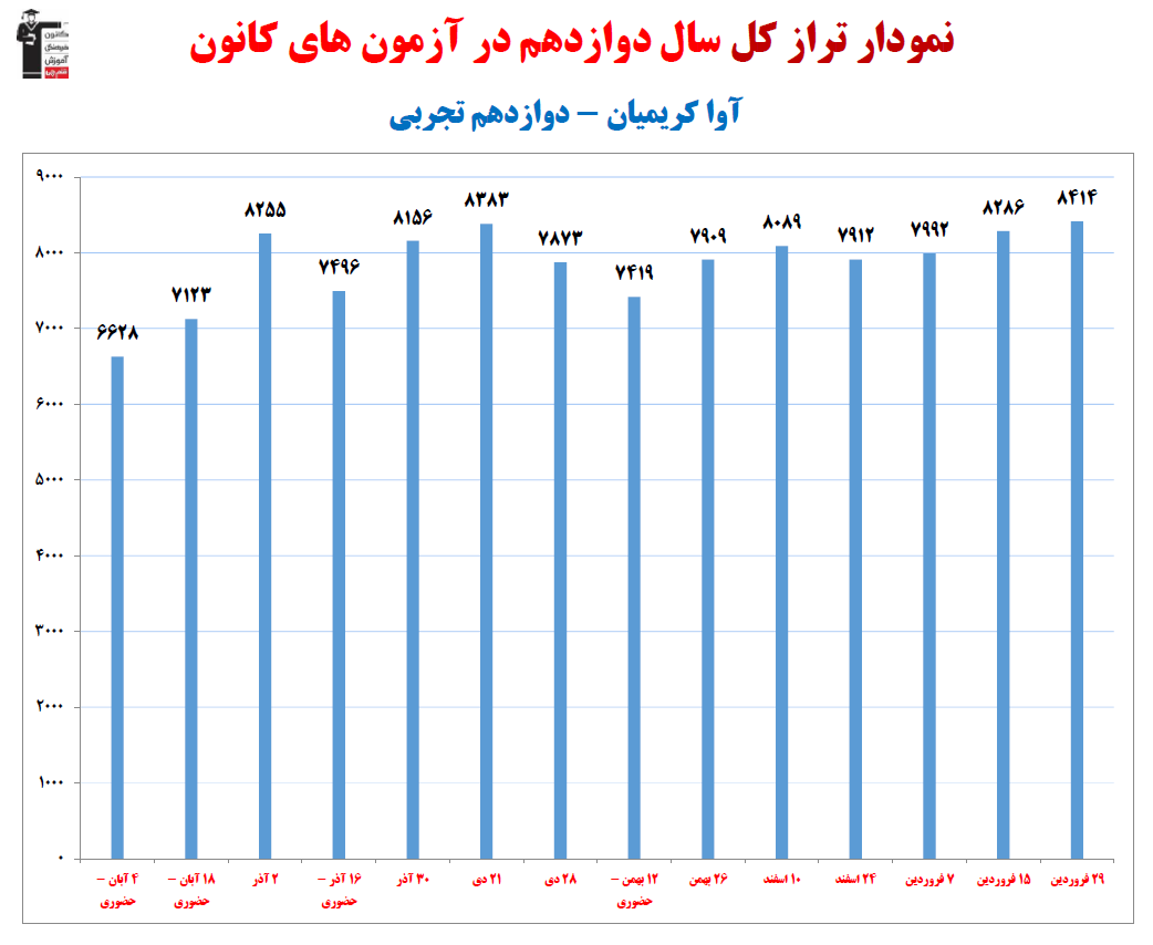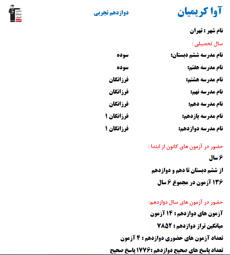 در ادامه میتوانید عملکرد درسی آوا کريميان را در کانون مشاهده کنید.نمودار پیشرفت میانگین تراز در پایههای مختلف،نمودار تراز کل، عملکرد آزمونهای سال دوازدهم و کارنامههای مبحثی در نمودارها و تصاویر زیر قابل مشاهده است.