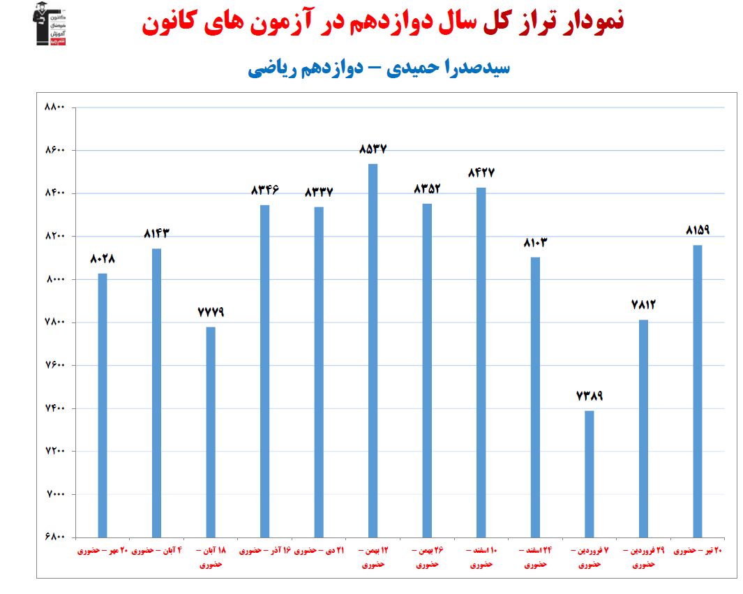 در ادامه میتوانید عملکرد درسی سيدصدرا حميدي را در کانون مشاهده کنید.نمودار پیشرفت میانگین تراز در پایههای مختلف،نمودار تراز کل، عملکرد آزمونهای سال دوازدهم و کارنامههای مبحثی در نمودارها و تصاویر زیر قابل مشاهده است.