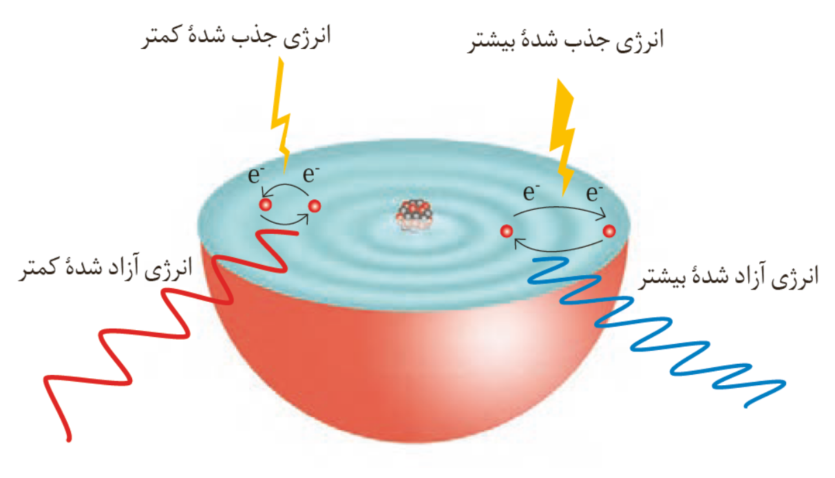 💠در نتیجۀ جابه جایی الكترون بین لایه ها، انرژی با طول موج معین جذب یا نشر می شود.