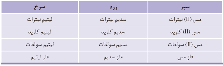🔅بسیاری از نمک ها شعلۀ رنگی دارند، به طوری که اگر مقداری از محلول نمک را با افشانه روی شعله بپاشیم، رنگ شعله تغییر می كند.