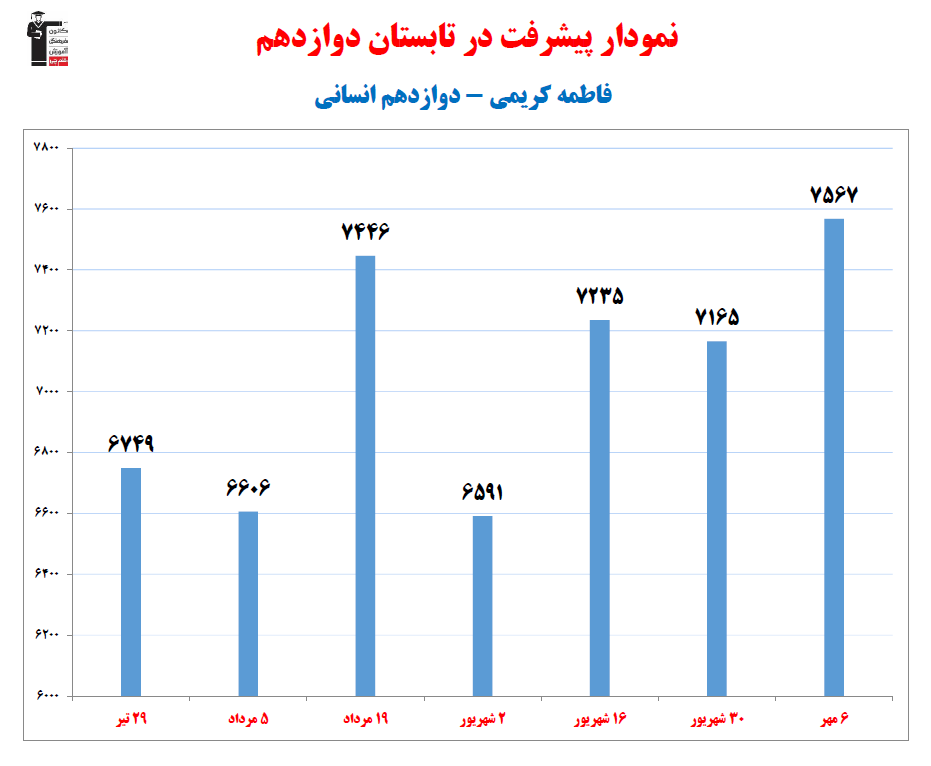 در ادامه میتوانید عملکرد درسی فاطمه کريمي را در کانون مشاهده کنید.نمودار تراز کل، عملکرد آزمونهای سال دوازدهم و شروع از تابستان و تراز آزمون های تابستان، کارنامههای مبحثی در نمودارها و تصاویر زیر قابل مشاهده است.