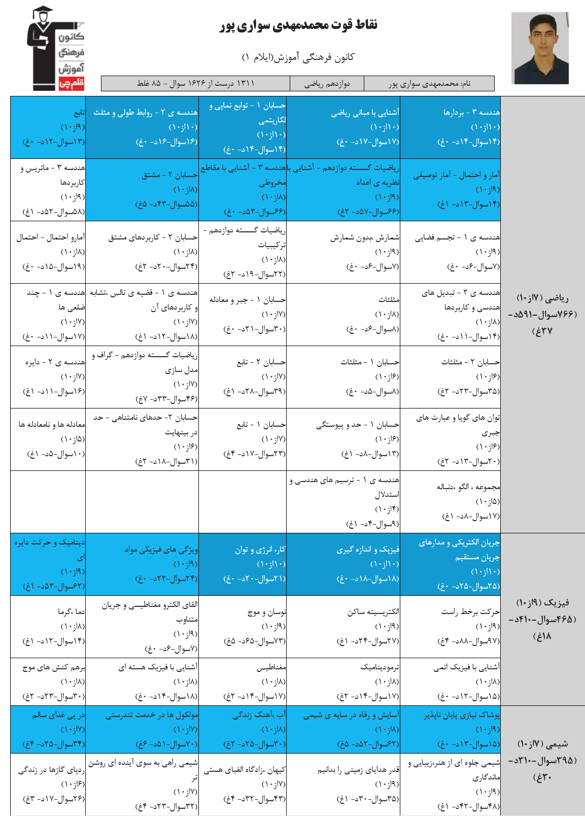 در ادامه میتوانید عملکرد درسی محمدمهدي سواري پور را در کانون مشاهده کنید.نمودار تراز کل، عملکرد آزمونهای سال دوازدهم وکارنامههای مبحثی در نمودارها و تصاویر زیر قابل مشاهده است.