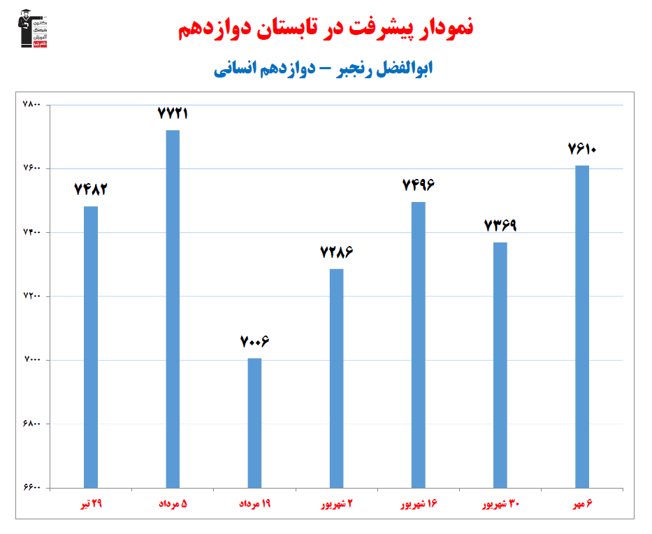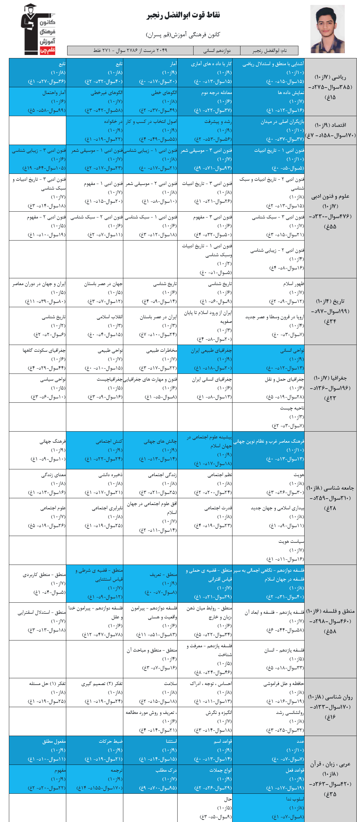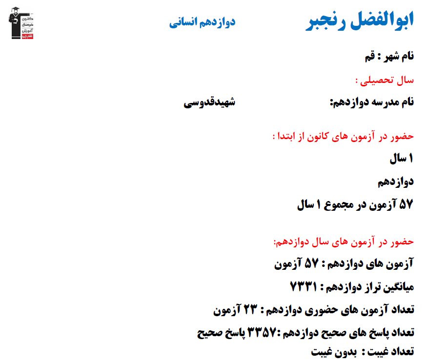 در ادامه میتوانید عملکرد درسی ابوالفضل رنجبر را در کانون مشاهده کنید. نمودار تراز کل، عملکرد آزمونهای سال دوازدهم و شروع از تابستان و تراز آزمون های تابستان، کارنامههای مبحثی در نمودارها و تصاویر زیر قابل مشاهده است.