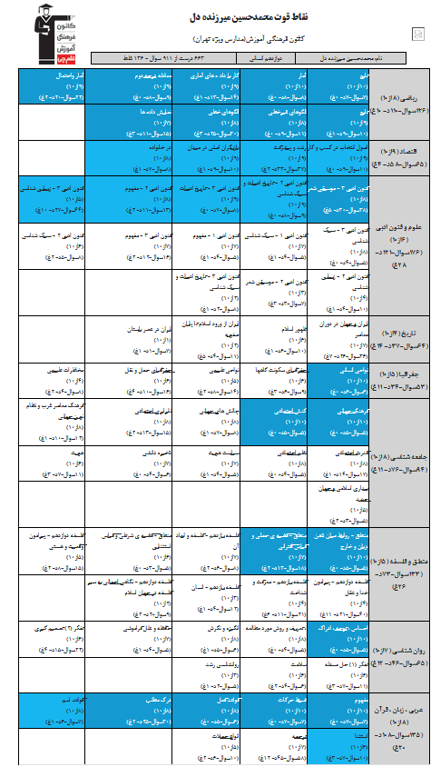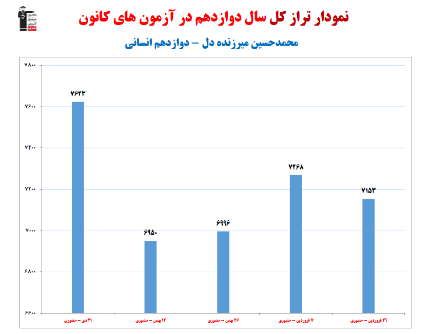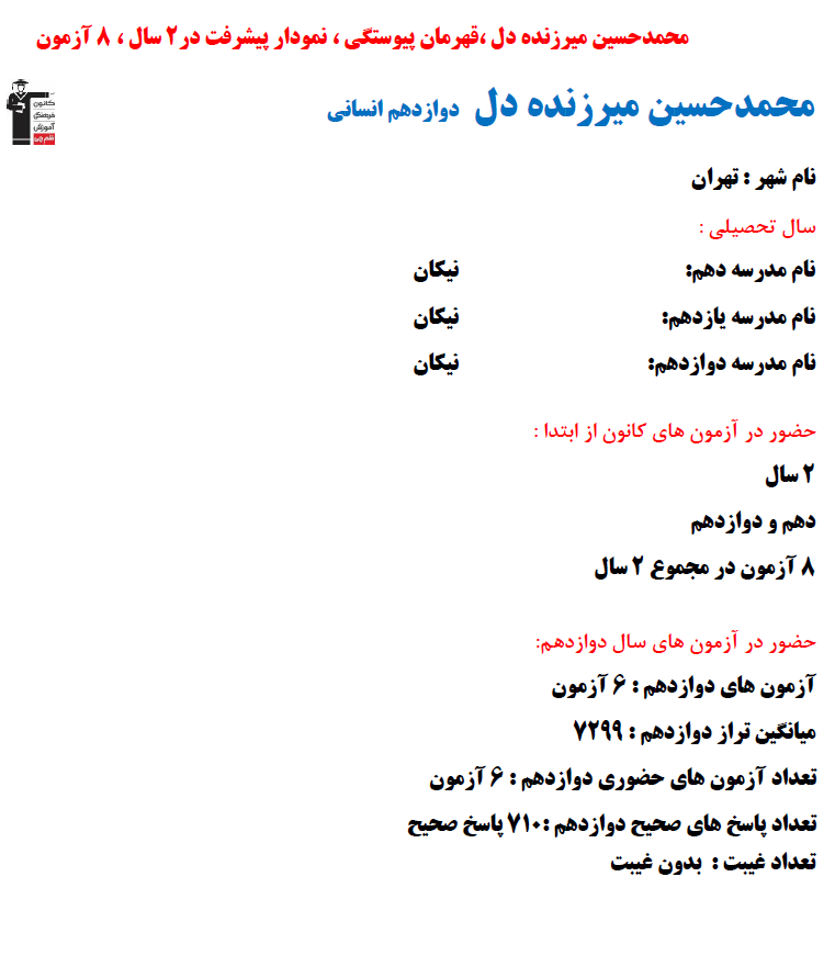 در ادامه میتوانید عملکرد درسی محمدحسین میرزندهدل را در کانون مشاهده کنید.نمودار پیشرفت میانگین تراز در پایههای مختلف، نمودار تراز کل، عملکرد آزمونهای سال دوازدهم، کارنامههای مبحثی در نمودارها و تصاویر زیر قابل مشاهده است.