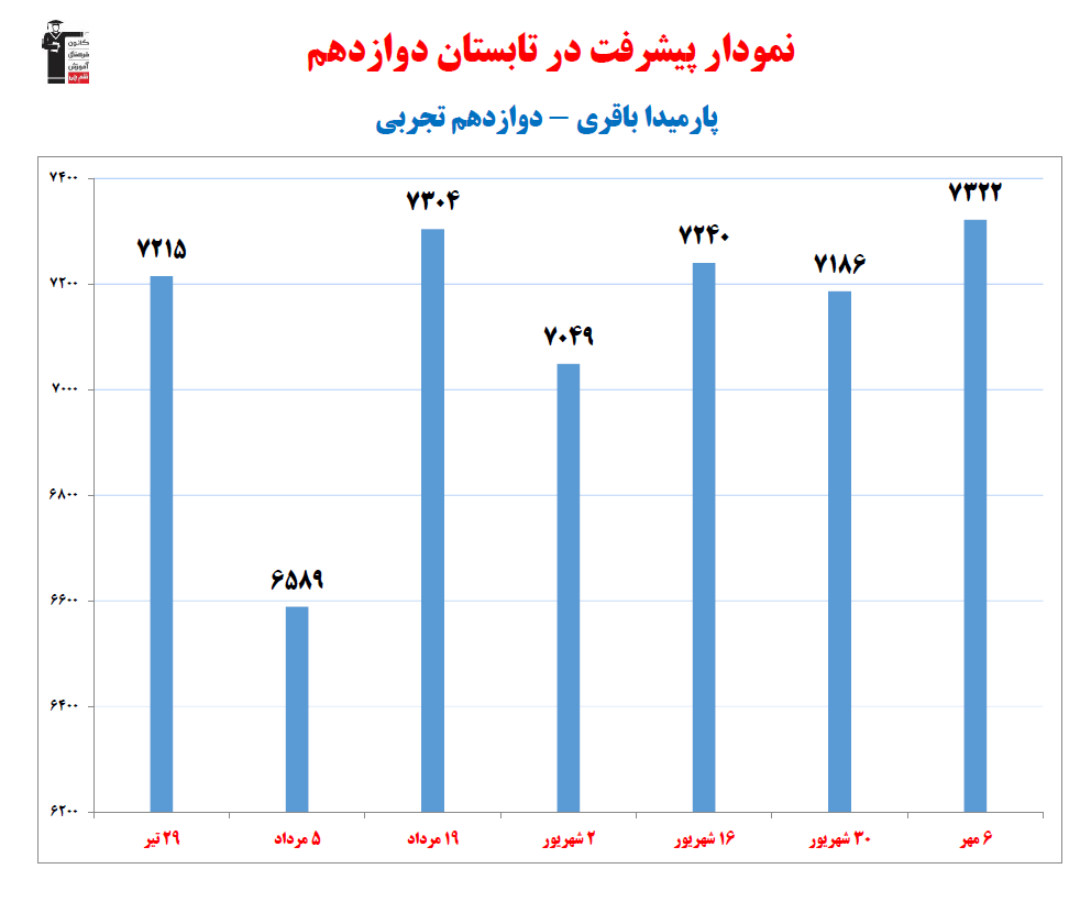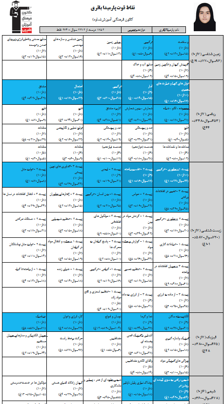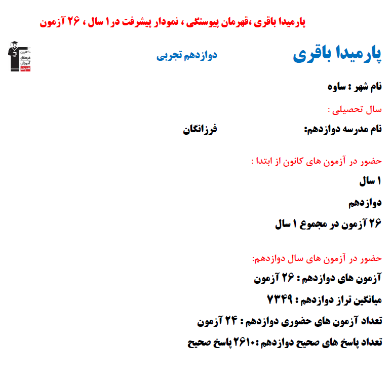 در ادامه میتوانید عملکرد درسی پارمیدا باقری را در کانون مشاهده کنید. نمودار تراز کل، عملکرد آزمونهای سال دوازدهم و شروع از تابستان و تراز آزمون های تابستان، کارنامههای مبحثی در نمودارها و تصاویر زیر قابل مشاهده است.