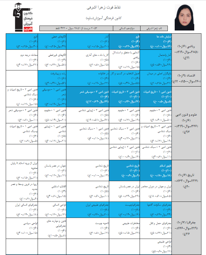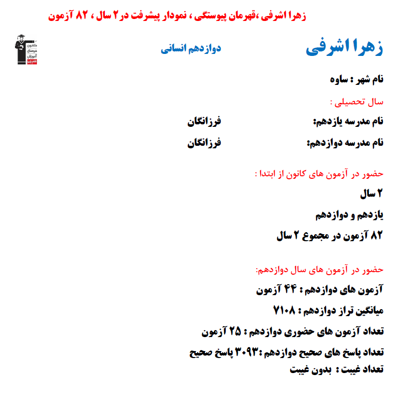 در ادامه میتوانید عملکرد درسی زهرا اشرفی را در کانون مشاهده کنید.