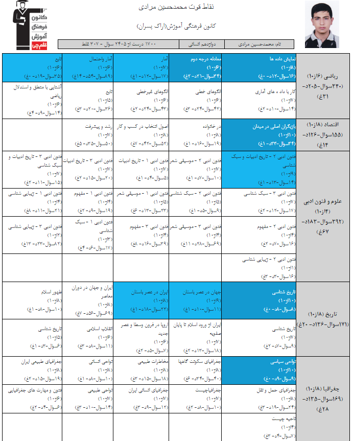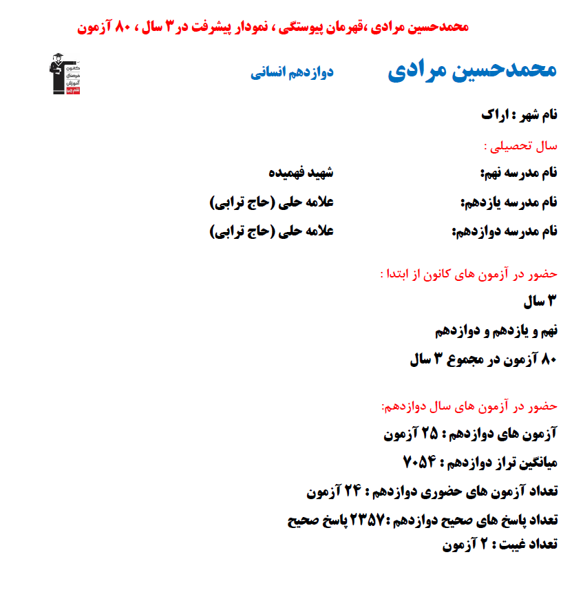 در ادامه میتوانید عملکرد درسی محمدحسین مرادی را در کانون مشاهده کنید.