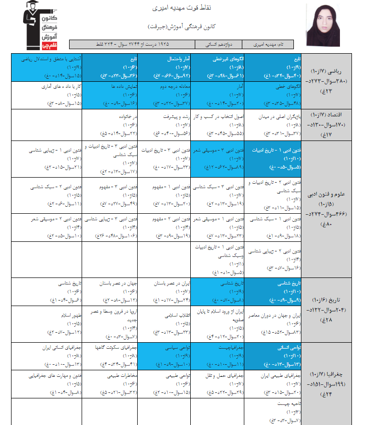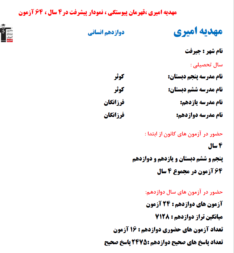 در ادامه میتوانید عملکرد درسی مهدیه امیری را در کانون مشاهده کنید.