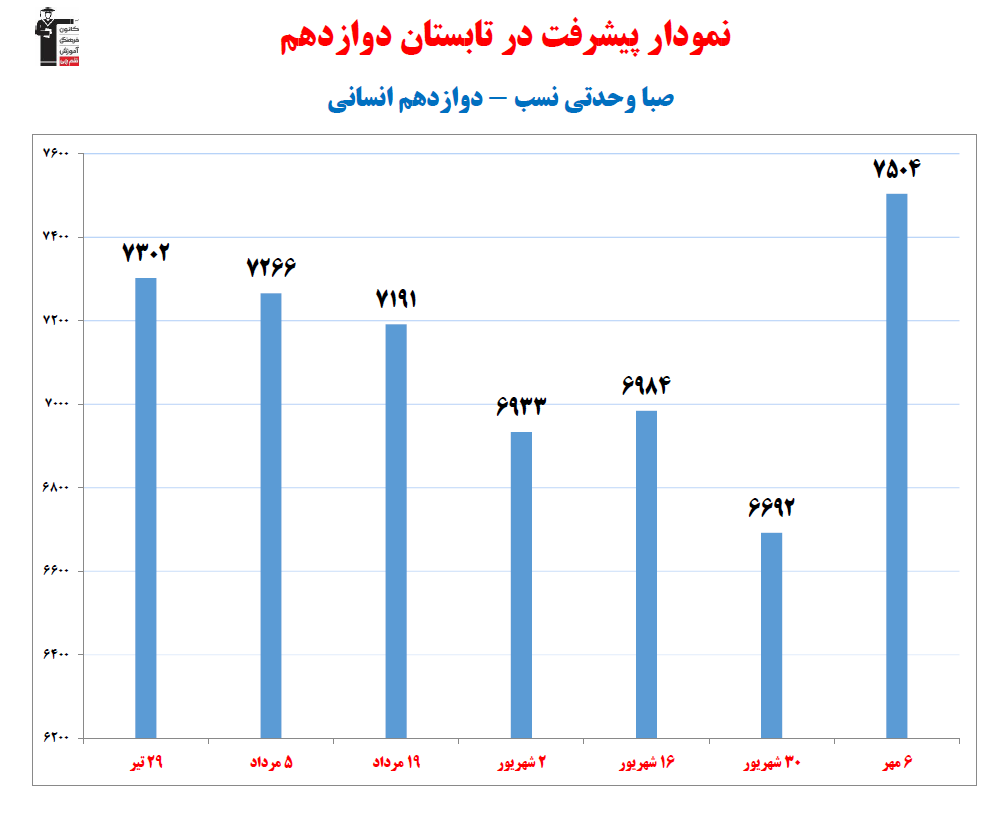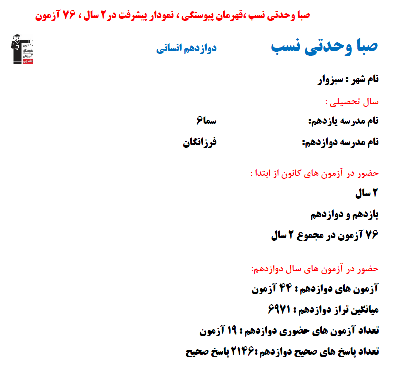 نمودار پیشرفت میانگین تراز در پایههای مختلف، نمودار تراز کل، عملکرد آزمونهای سال دوازدهم و شروع از تابستان و تراز آزمون های تابستان، کارنامههای مبحثی در نمودارها و تصاویر زیر قابل مشاهده است.