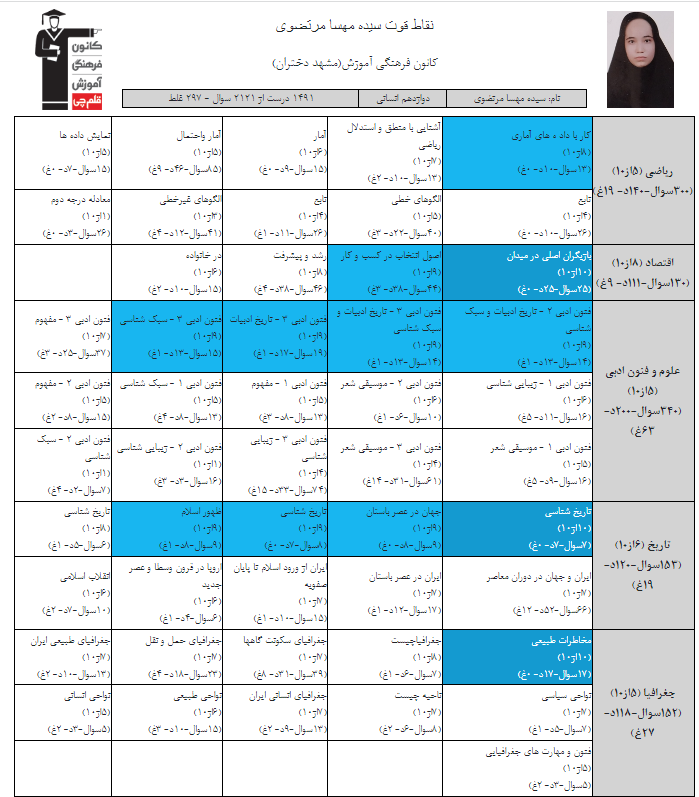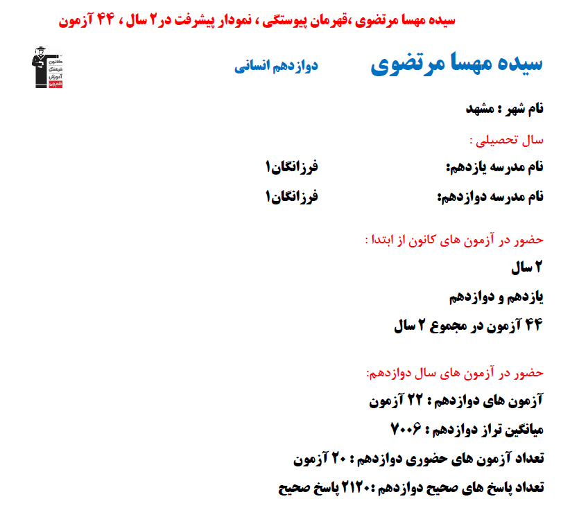 در ادامه میتوانید عملکرد درسی سیده مهسا مرتضوی را در کانون مشاهده کنید.