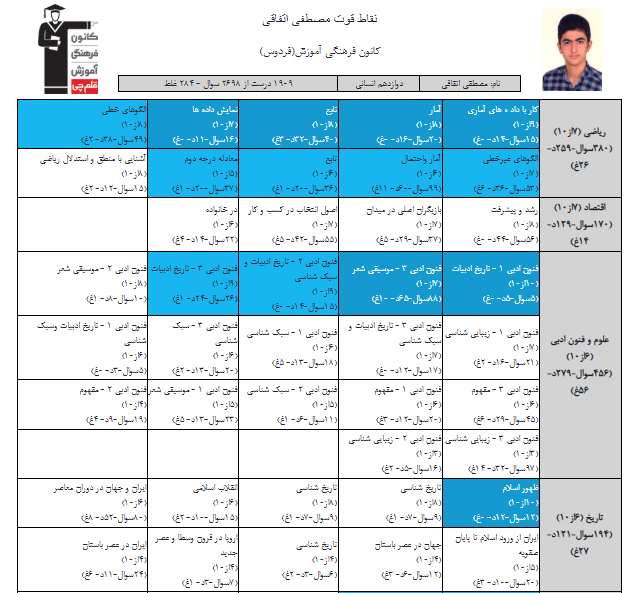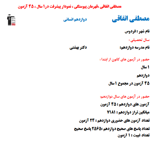 در ادامه میتوانید عملکرد درسی مصطفی اتفاقی را در کانون مشاهده کنید. نمودار تراز کل، عملکرد آزمونهای سال دوازدهم و شروع از تابستان و تراز آزمون های تابستان، کارنامههای مبحثی در نمودارها و تصاویر زیر قابل مشاهده است.