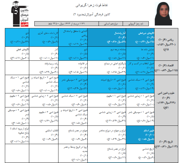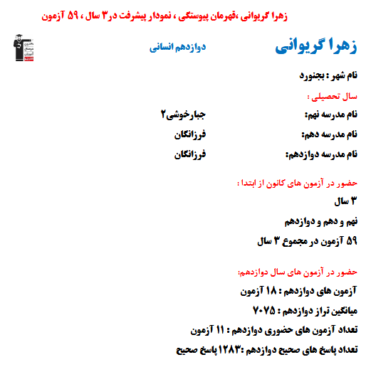 در ادامه میتوانید عملکرد درسی زهرا گریوانی را در کانون مشاهده کنید.نمودار پیشرفت میانگین تراز در پایههای مختلف، نمودار تراز کل، عملکرد آزمونهای سال دوازدهم، کارنامههای مبحثی در نمودارها و تصاویر زیر قابل مشاهده است.