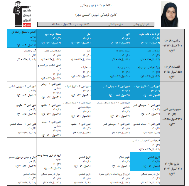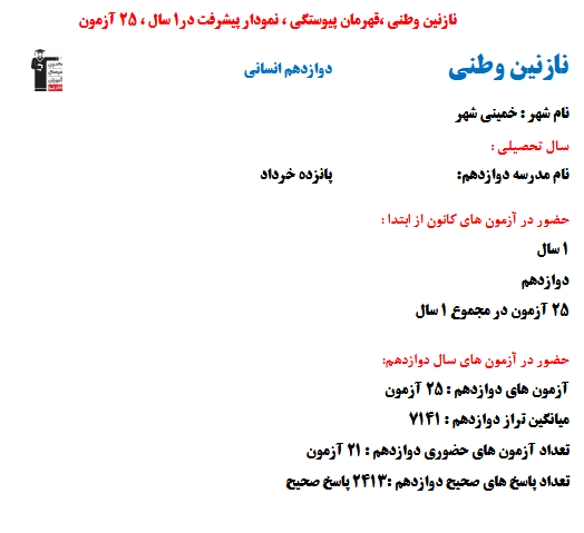 در ادامه میتوانید عملکرد درسی نازنین وطنی را در کانون مشاهده کنید. نمودار تراز کل، عملکرد آزمونهای سال دوازدهم و شروع از تابستان و تراز آزمون های تابستان، کارنامههای مبحثی در نمودارها و تصاویر زیر قابل مشاهده است.