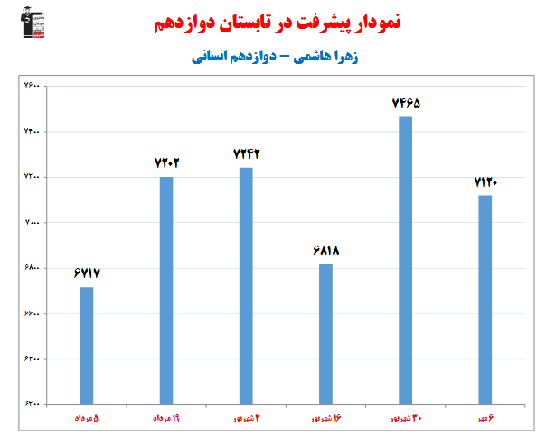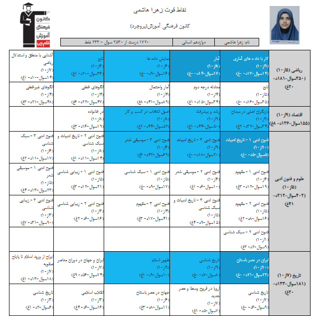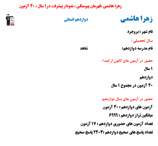 در ادامه میتوانید عملکرد درسی زهرا هاشمی را در کانون مشاهده کنید. نمودار تراز کل، عملکرد آزمونهای سال دوازدهم و شروع از تابستان و تراز آزمون های تابستان، کارنامههای مبحثی در نمودارها و تصاویر زیر قابل مشاهده است.