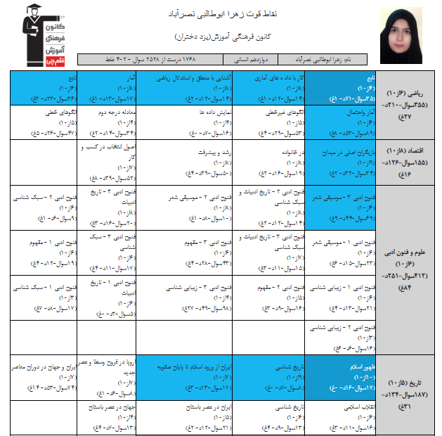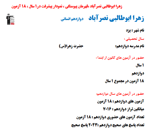 در ادامه میتوانید عملکرد درسی زهرا ابوطالبی را در کانون مشاهده کنید. نمودار تراز کل، عملکرد آزمونهای سال دوازدهم ، کارنامههای مبحثی در نمودارها و تصاویر زیر قابل مشاهده است.