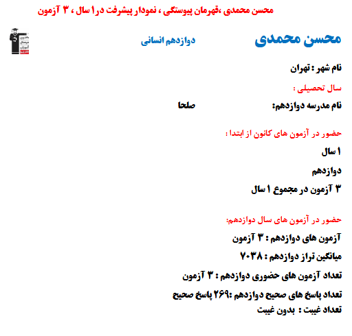 در ادامه میتوانید عملکرد درسی محسن محمدی را در کانون مشاهده کنید. نمودار تراز کل، عملکرد آزمونهای سال دوازدهم ، کارنامههای مبحثی در نمودارها و تصاویر زیر قابل مشاهده است.