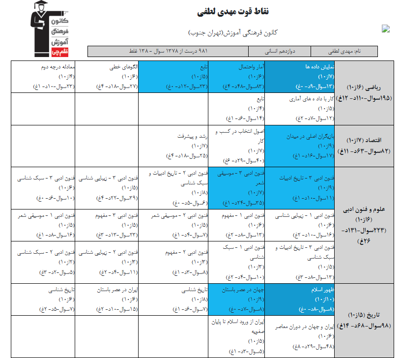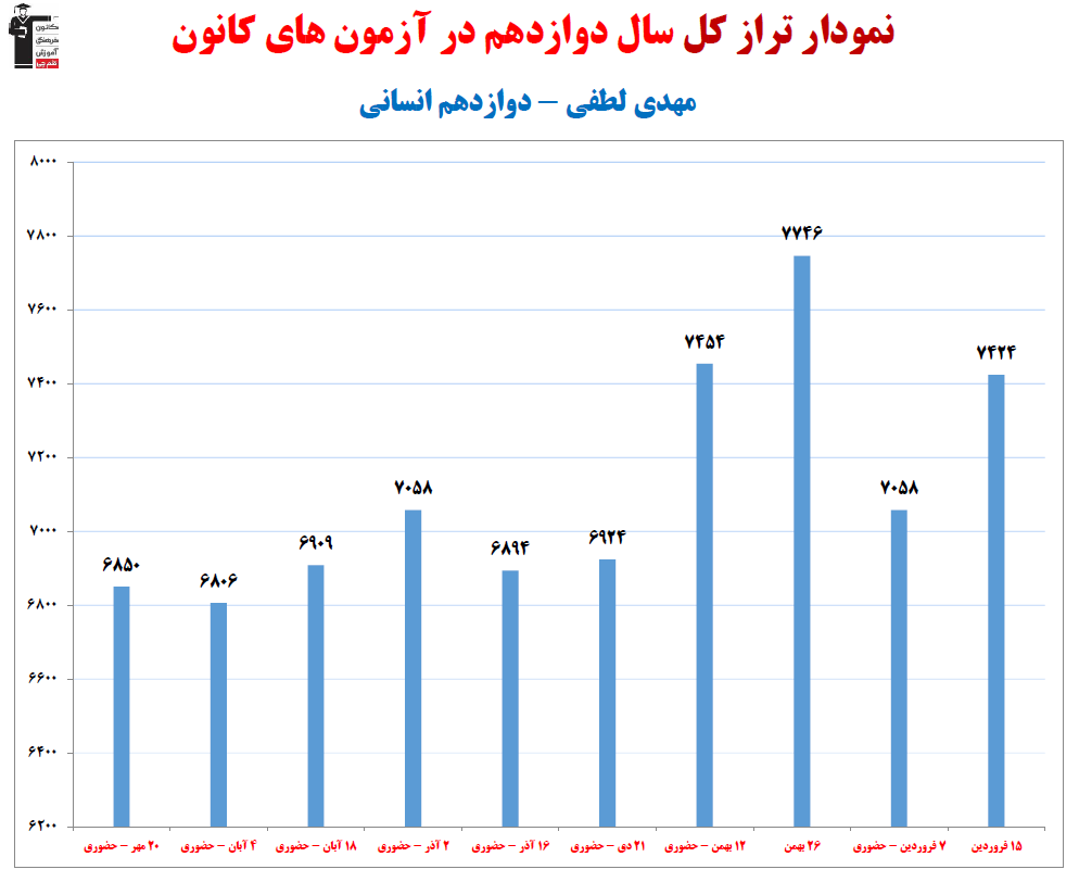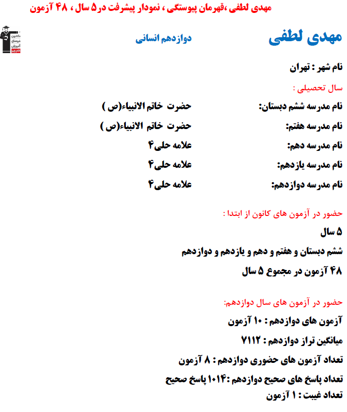 در ادامه میتوانید عملکرد درسی مهدی لطفی را در کانون مشاهده کنید.نمودار پیشرفت میانگین تراز در پایههای مختلف، نمودار تراز کل، عملکرد آزمونهای سال دوازدهم، کارنامههای مبحثی در نمودارها و تصاویر زیر قابل مشاهده است.