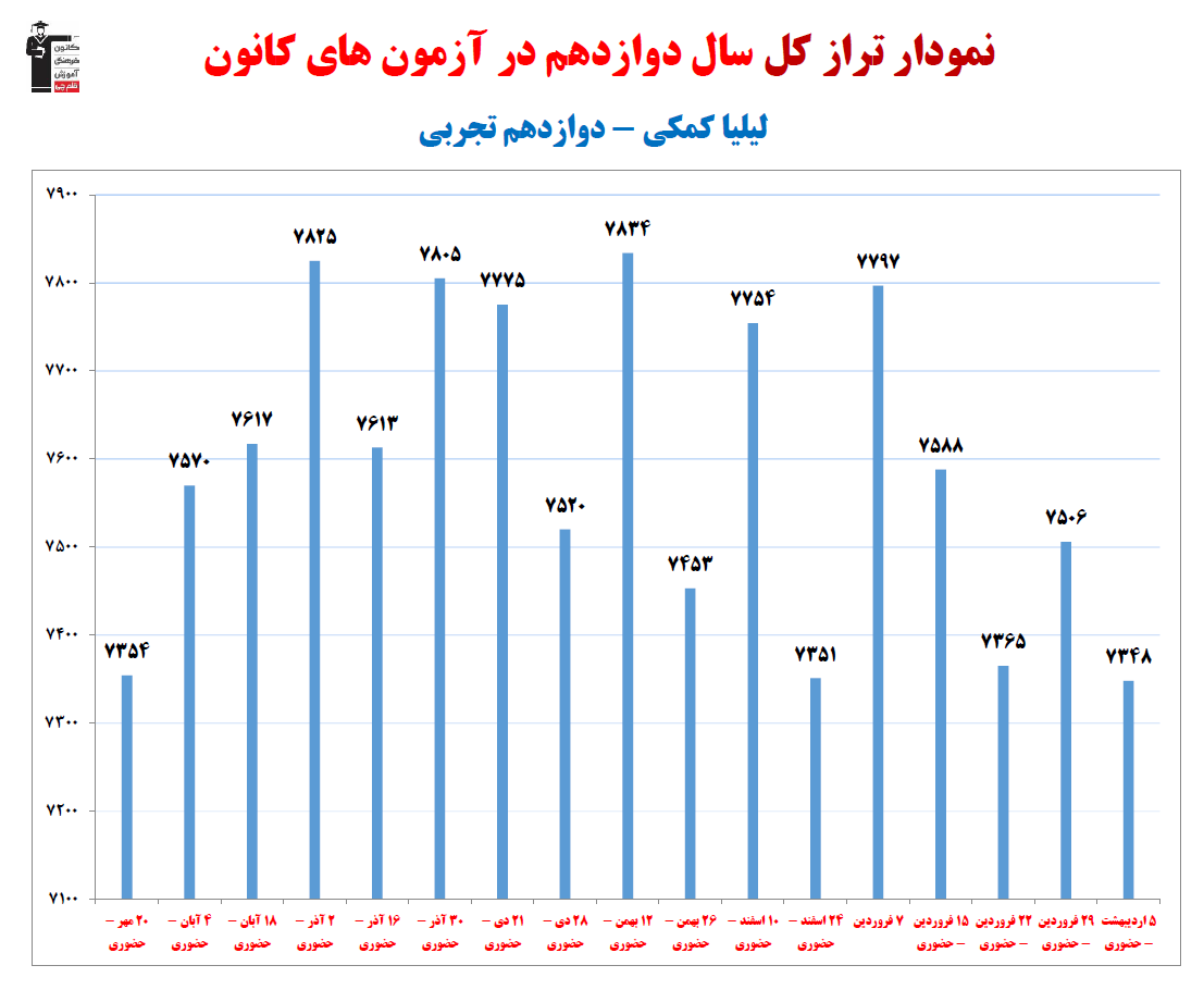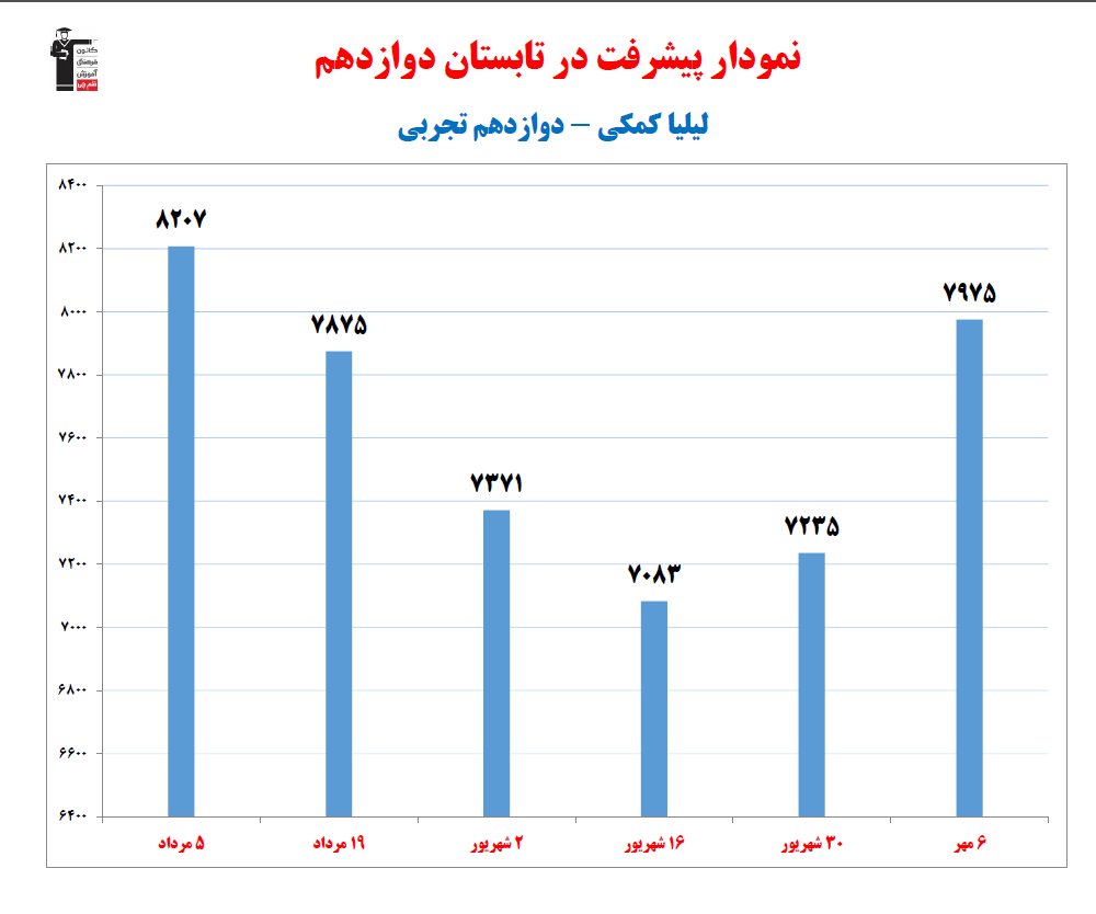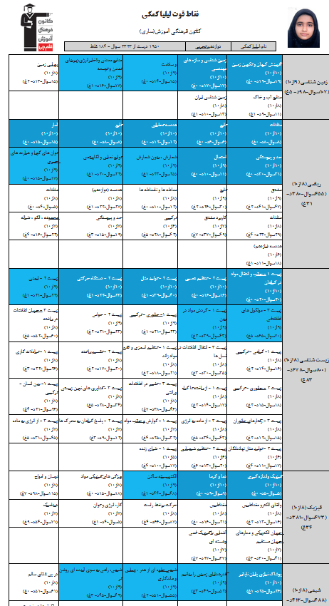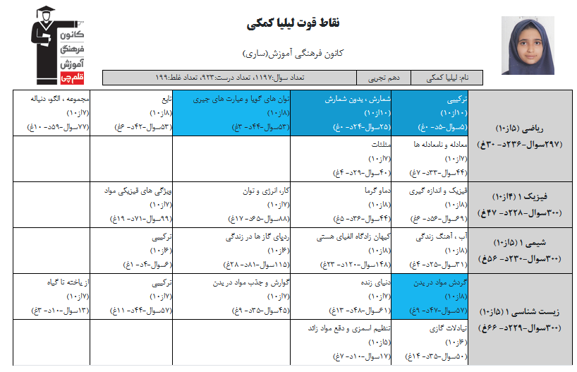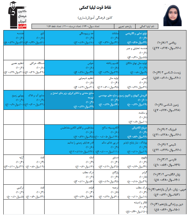 در ادامه میتوانید عملکرد درسی لیلیا کمکی را در کانون مشاهده کنید. نمودار تراز کل، عملکرد آزمونهای سال دوازدهم و شروع از تابستان و تراز آزمون های تابستان، کارنامههای مبحثی در نمودارها و تصاویر زیر قابل مشاهده است.