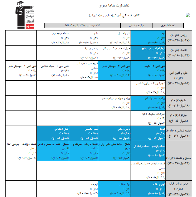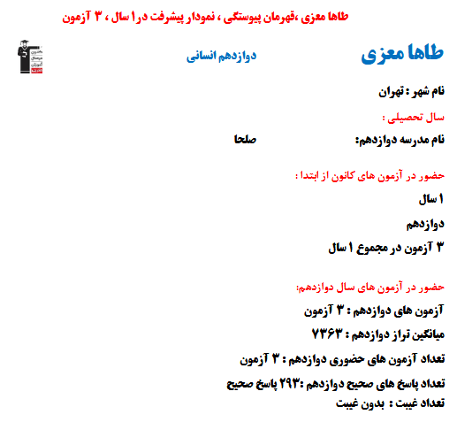 در ادامه میتوانید عملکرد درسی طاها معزی را در کانون مشاهده کنید.نمودار تراز کل، عملکرد آزمونهای سال دوازدهم ، کارنامههای مبحثی در نمودارها و تصاویر زیر قابل مشاهده است.